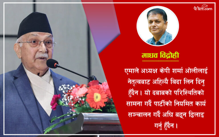 त्यसकारण, एमाले अध्यक्ष केपी शर्मा ओलीले केही कमी कमजोरीहरु सुधार गर्दै नेतृत्वबाट अहिल्यै विदा लिन, दिनु हुन्न। यो दवावको परिस्थितिको सामना गर्दै पार्टीको नियमित कार्य सञ्चालन गर्दै अघि बढ्न ढिलाई गर्नु हुन्न।