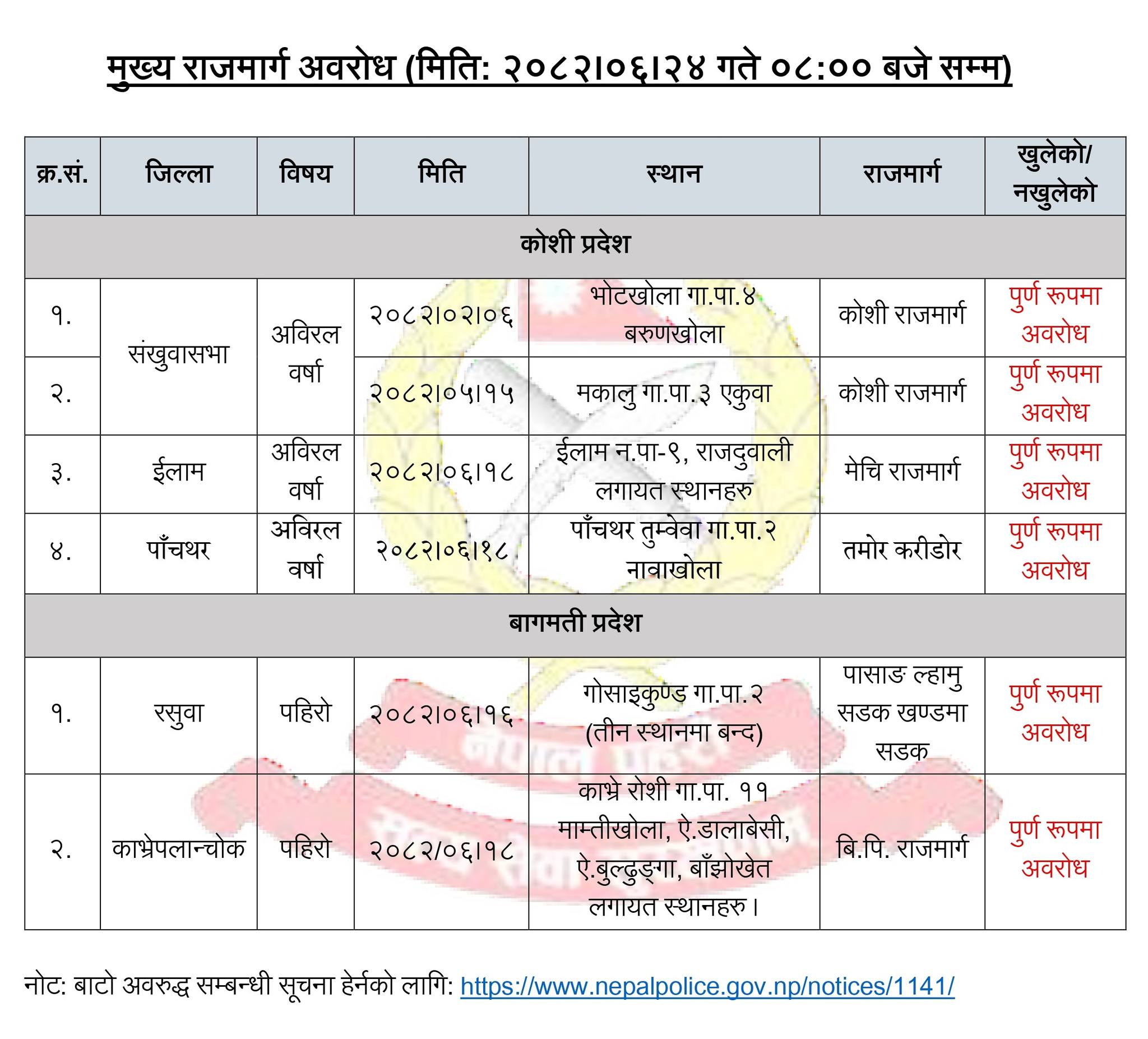 कोसी राजमार्गमा पर्ने संखुवासभाको भोटखोला र मकालुमा, इलामको इलाम नगरपालिका(९ मा मेची राजमार्ग, पाँचथरको तमोर करिडोर, रसुवाको गोसाइँकुण्डमा पासाङ ल्यामु सडक, काभ्रेको रोसी गाउँपालिका-११ स्थित माम्तीखोला, सोही वडाको डालाबेसी, बुल्ढुंगा र बाँझोखेतमा सडक अवरुद्ध छ।