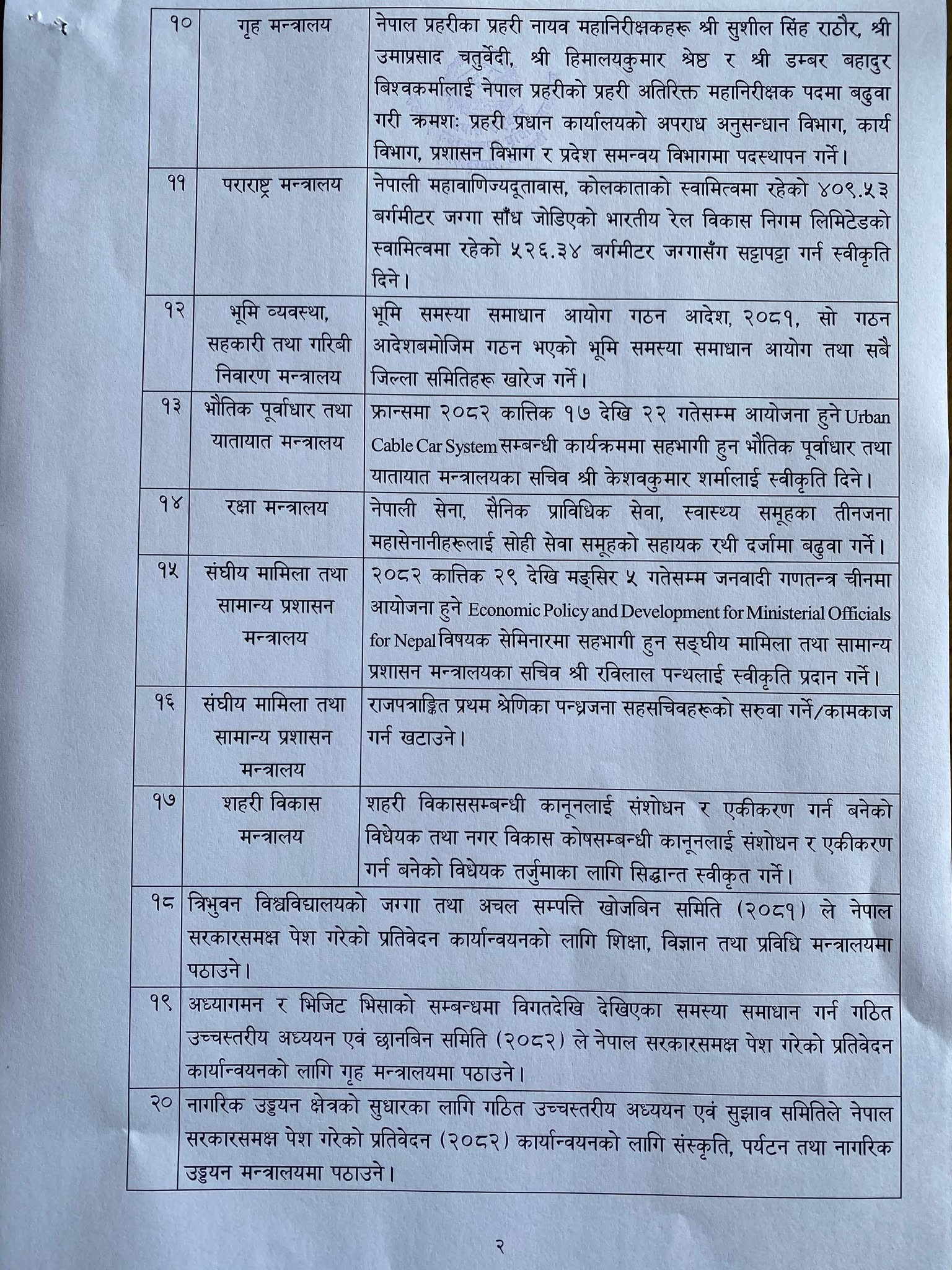 नेपाल प्रहरीका प्रहरी नायव महानिरीक्षकहरु सुशील सिंह राठौर, उमाप्रसाद चतुर्वेदी, हिमालयकुमार श्रेष्ठ, डम्बर बहादुर विश्वकर्मालाई नेपाल प्रहरीको प्रहरी अतिरिक्त महानिरीक्षक पदमा बढुवा गरी क्रमश : प्रहरी प्रधान कार्यालयको अपराध अनुसन्धान विभाग, कार्य विभाग, प्रशासन विभाग र प्रदेश समन्वय विभागमा पदस्थापना गर्ने निर्णय बैठकले गरेको छ।