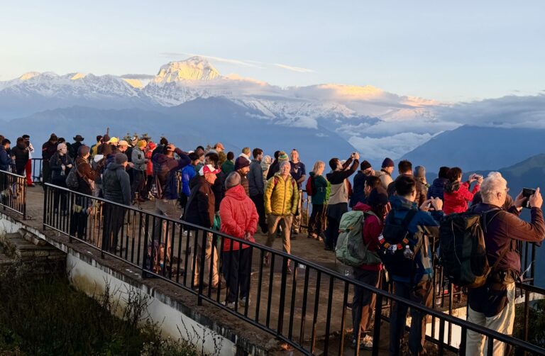 चराहरूको चिरबिरसँगै विस्तारै हिमाल खुल्न थाल्छ। घामको पहिलो झुल्का हिउँचुचुरोमा पर्दाको दृश्यले मोहित तुल्याउँछ। छिनभरमै घामका कलिला किरण पुनहिलमा छाइसक्छन्। हिमालको काखबाट सूर्य उदाएको दृश्यले कसलाई पो नलोभ्याउला र १ सूर्योदयको मनप्रिय दृश्यलाई आँखादेखि क्यामेरासम्म कैद गर्नेहरूको तछाडमछाड देखिन्छ। विदेशीहरू आफ्नै देशको झण्डा ओडेर तस्बिर खिचिरहेका भेटिन्छन् भने नेपालीहरू चन्द्र-सूर्य अङ्कित झण्डासहित।