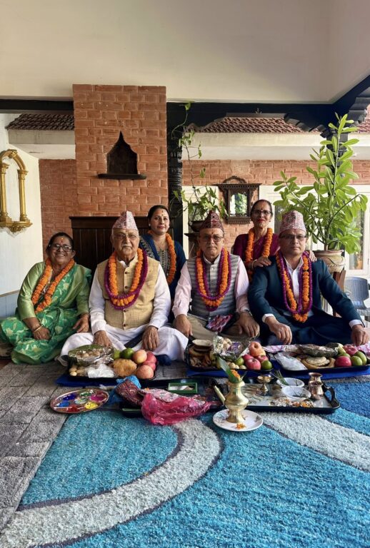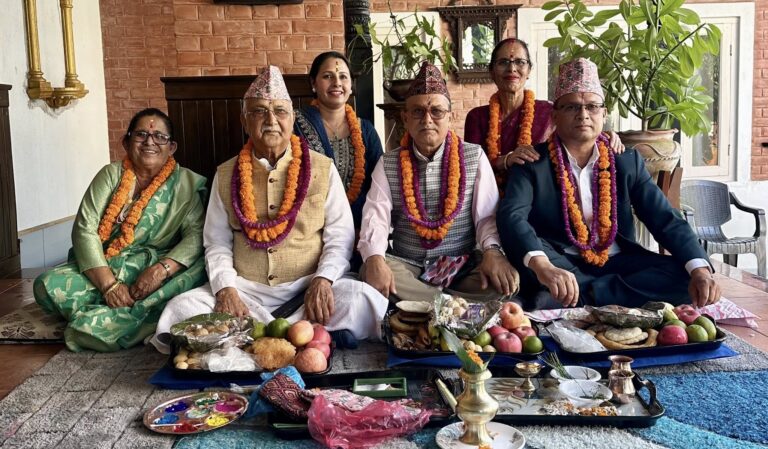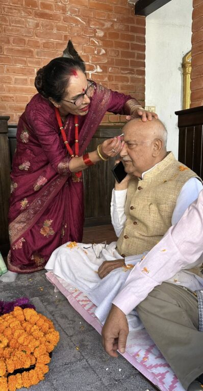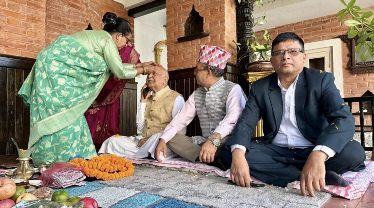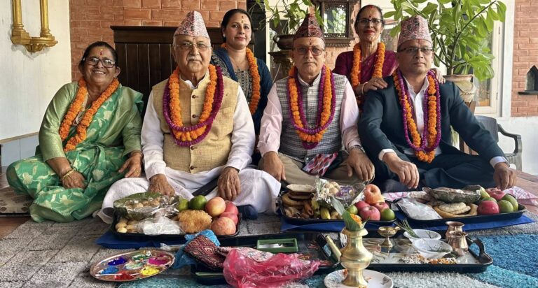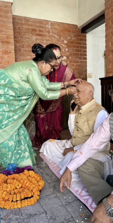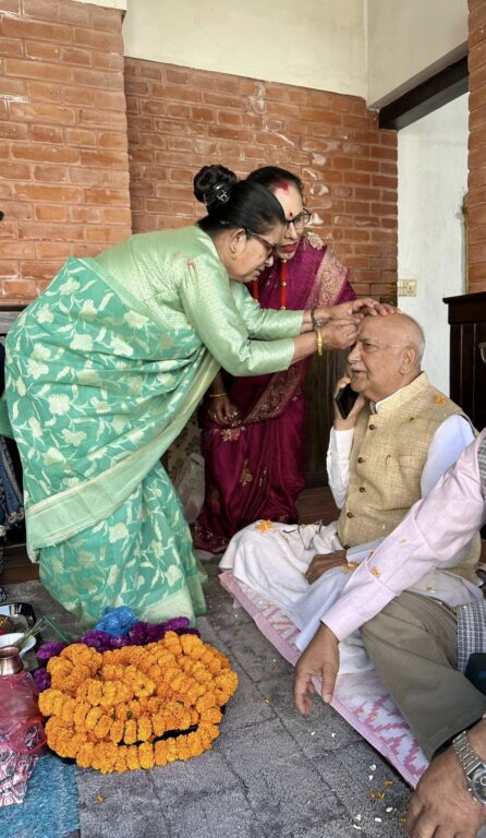 काठमाडौं-नेकपा एमालेका अध्यक्ष एवं पूर्व प्रधानमन्त्री केपी शर्मा ओलीले बहिनीहरूको हातबाट भाइटीका लगाउनुभएको छ। बिहीबार भाइटीकाको अवसरमा शुभ साइतमा अध्यक्ष ओलीले तीन बहिनीहरू विष्णुमाया ढकाल, कौशल्या कोइराला र विष्णुकुमारी पौडेलको हातबाट भाइटीका ग्रहण गर्नुभएको हो।
