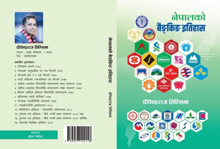 काठमाडौं-बैङ्क केवल मुद्रा राख्ने थलो मात्र नभएर अर्थतन्त्रको मुख्य अङ्ग हो । नेपालमा बैङ्क खुलेको ८८ बर्ष पुगेको छ । राणाकालीन अबस्था देखि वर्तमान समय सम्मका नेपालको बैङ्कको इतिहास समेटिएको पुस्तक प्रकाशन भएको छ । मोरङ पथरी शनिश्चरे १ निवासी खोजकर्ता लेखक दीपेन्द्रराज तिम्सिनाले उक्त पुस्तक लेख्नु भएको हो । यस पुस्तककमा नेपालको मुद्रा निष्कासनको इतिहास, राणाकालीन देखि वर्तमान सम्मको बैङ्किङ इतिहास समेटेर तिम्सिनाले (नेपालको बैङ्किङ इतिहास) नामक पुस्तक बजारमा ल्याउनुभएको छ । यो पुस्तकमा नेपालका क र ख श्रेणीका बैङ्कहरुको चिनारी, पहिलो गभर्नर हिमालय शमशेरदेखि अहिलेका विश्वनाथ पौडेलसम्मकै १८ जना गभर्नरको फोटो सहितको जीवनी, द्वन्द्वकालमा बैङ्कमा भएको आक्रमण, नेपाली बैङ्क मर्जरको इतिहास, राणाकालमा वेलायतबाट फर्केका नेपालमा बैङ्क खोल्ने अगुवा सरदार गुञ्जमान सिंह, बैङ्किङ क्षेत्रका अगुवा बिके श्रेष्ठ, विदेशी बैङ्क भित्र्याउने डा. प्रकाशचन्द्र लोहनी सहितको इतिहास मिहिन गरि खोजेर पुस्तकमा राखिएको छ । नेपाली बैङ्ले पाएको राष्ट्रिय अन्तर्राष्ट्रिय अवार्डहरु, बैङ्किङ क्षेत्रमा महिला सहभागीता, विपत्तमा बैङ्कको सहयोग, बैङ्क तथा वित्तीय संस्था सम्बन्धि ऐन, कानुन हरू, खारेज भएका बैङ्कहरु, चिनियाँ ह्याकरले मच्चाएको लुटपाट, लिच्छविकाल देखिका मुद्रा खोज गरि लेखिएको छ । तत्कालीन कुन कुन बैङ्क कहिले स्थापना भए, समस्या ग्रस्त बैङ्कहरू, भोजपुरको टक्सारको इतिहास , पुर्वमा खुलेका बैङ्कहरु, बैङ्किङ क्षेत्रमा महिला सहभागीता, डेपुटी तथा कार्यवाहक गभर्नर डा. निलम ढुङ्गाना तिमिल्सिना, बैङ्किङ अधिकारको क्षेत्रमा कार्यरत संघ, संस्थाहरु लगायतका विभिन्न ५१ बटा विषयमा समेटेर लेखिएको २७२ पेजको पुस्तकमा नेपालमा जेनजी आन्दोलनको समयमा नेपाली बैङ्कमा भएको क्षतिको बिषयमा पनि खोज गरि लेखिएकोछ । झापा दमकको स्रष्टा छापाखानाले छापेको लिला निरौला प्रकाशक रहेको यो तिम्सिनाको १४ ओै पुस्तक हो । लेखक तिम्सिना विगत एक दशकदेखि निरन्तर खोजमुलक पुस्तक लेखनमा संलग्न हुनुहुन्छ । नेपाली बैङ्किङ इतिहास बुझ्न यो पुस्तक राम्रो सहयोगी बन्ने नेपाल बैङ्कर्स संघका अध्यक्ष सन्तोष कोइरालाले दिएको शुभकामनामा उल्लेख छ ।