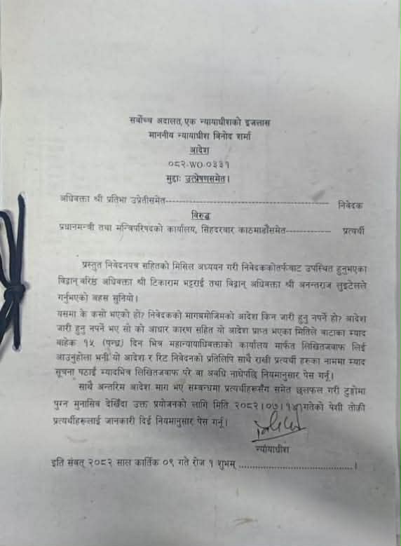 अदालतले सरकारका नाममा आदेश जारी गर्दै सरकारलाई अदालत उपस्थित भई फिर्ता गर्नुको कारण पेश गर्न आदेश दिएको हो।