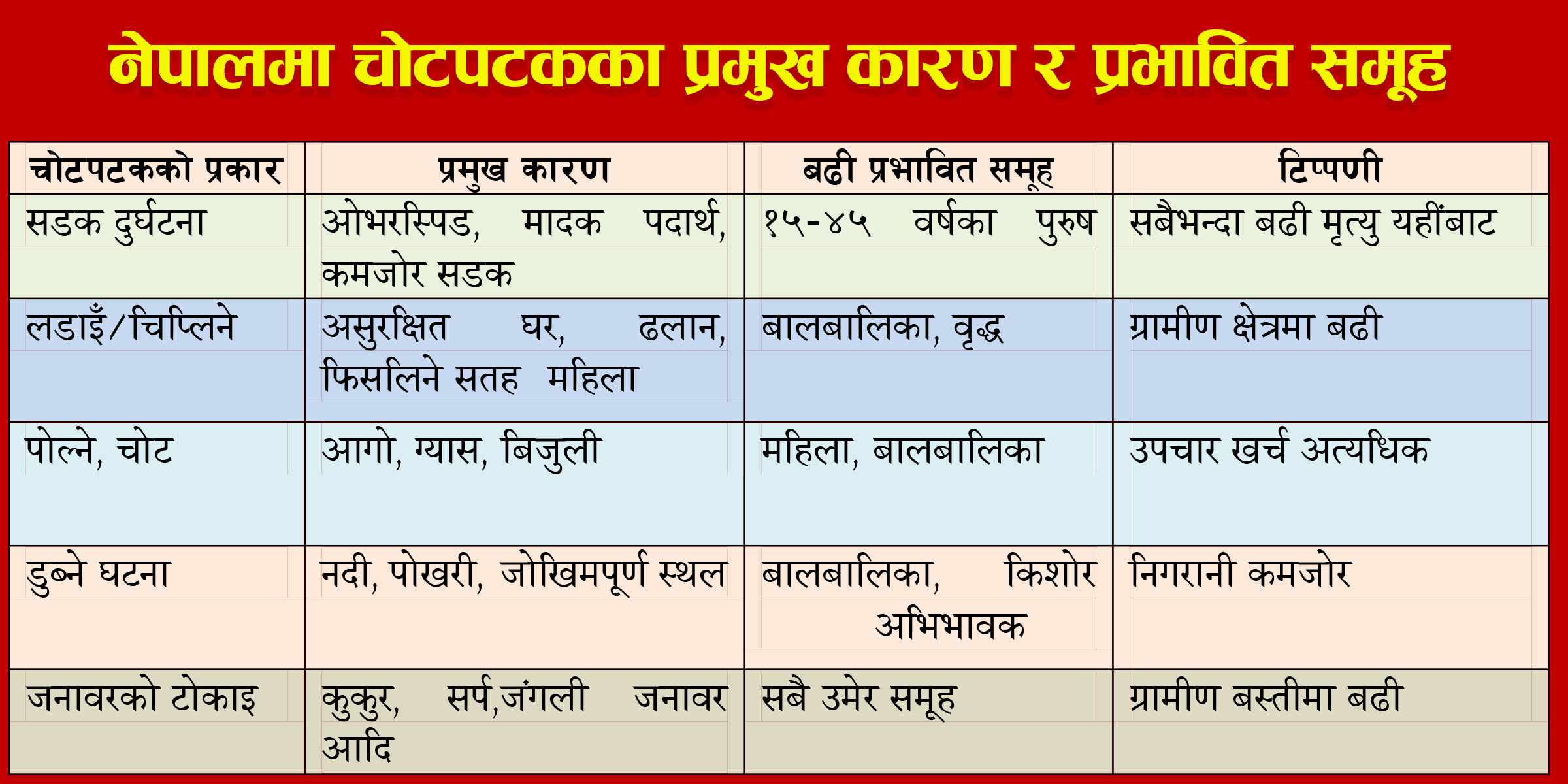 नेपालमा चोटपटक अब केवल व्यक्तिगत समस्या मात्र नभई, राष्ट्रिय सार्वजनिक स्वास्थ्य सङ्कटको रूपमा देखिन थालेको छ। सिडिपिएसको अध्ययन अनुसार, चोटपटकका कारण हरेक वर्ष हजारौं नेपाली अनावश्यक रूपमा मृत्यु वा अपाङ्गता भोगिरहेका छन्। चोटपटक सामान्यता गाडी दुर्घटनाबाट मात्र हो भन्ने हाम्रो बुझाइ छ। जुन गलत हो। घरमा काम गर्दा वा भीरबाट लडेर हुने चोटपटकको संख्या पनि कम छैन।