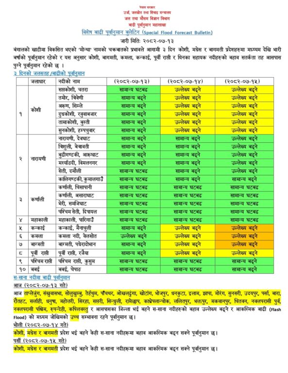 आगामी तीन दिन बाढी आउन सक्ने नदी तथा खोलाहरुको विवरण महशाखाले सार्वजनिक गरेको छ । उक्त दनी तथा खोलाको तटीय क्षेत्रमा बसोबास गर्नेहरुलाई आज,भोली र पर्सी उच्च सतर्कता अपनाउन महाशाखाले अनुरोध गरेको छ ।