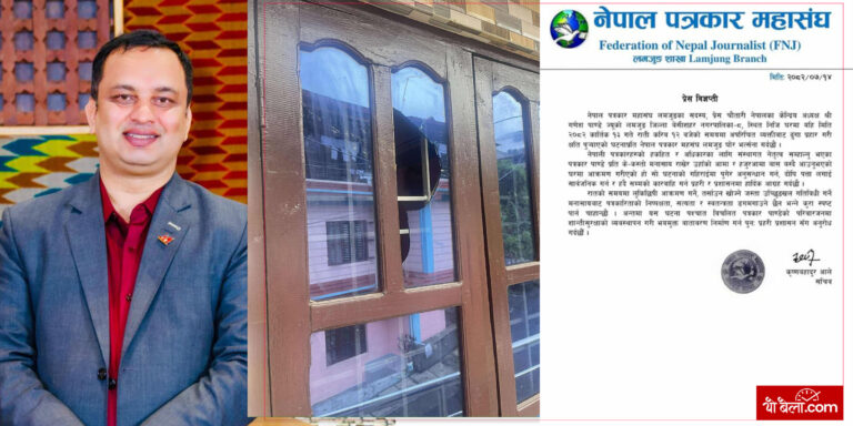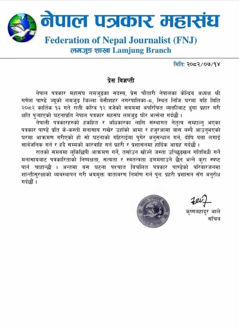 महासंघले शुक्रबार जारी गरेको विज्ञप्तिमा लमजुङ जिल्ला बेसीशहर नगरपालिका-८ स्थित पाण्डेको निजी घरमा २०८२ कात्तिक १३ गते राति करिब १२ बजे अपरिचित व्यक्तिहरूले ढुङ्गा प्रहार गरी क्षति पुर्याएको घटनाप्रति आपत्ति जनाइएको छ। विज्ञप्तिमा भनिएको छ, ‘नेपाली पत्रकारहरूको हकहित र अधिकारका लागि संस्थागत नेतृत्व सम्हाल्नुभएका पत्रकार पाण्डेमाथि यो आक्रमण अत्यन्त निन्दनीय छ, उहाँको आमा र हजुरआमा बस्दै आउनुभएको घरमा ढुंगा प्रहार हुनु योजनाबद्ध र आपराधिक मनसायसहित गरिएको कार्य हो।’