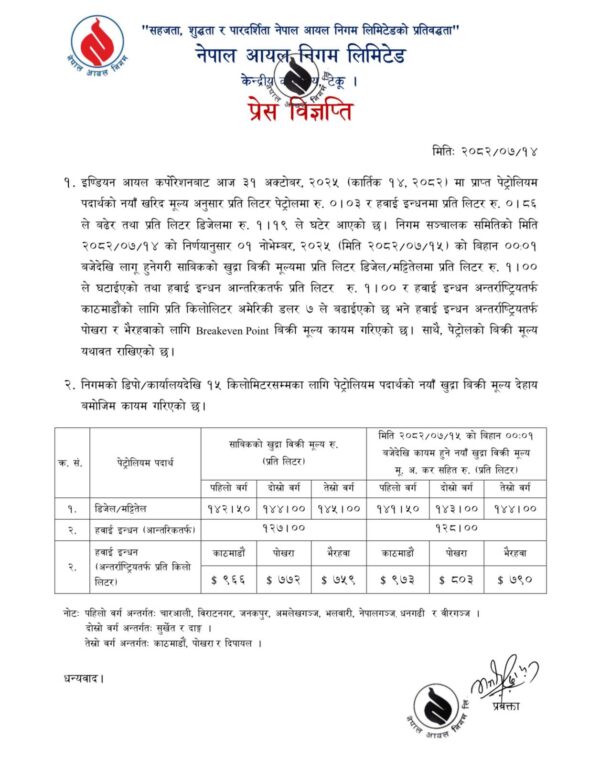 शुक्रबार राति १ बजेदेखि लागू हुने गरी निगमले हवाई इन्धन आन्तरिकतर्फ प्रतिलिटर एक रुपैयाँ र हवाई इन्धन अन्तर्राष्ट्रियतर्फ काठमाडौंका लागि प्रतिकिलोलिटर अमेरिकी डलर सातले बढाइएको जानकारी दिएको छ ।