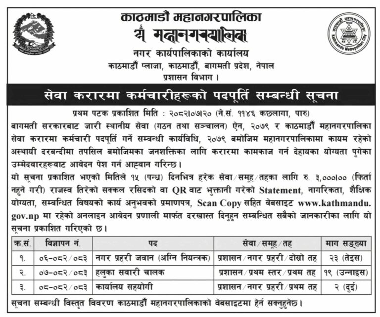 बागमती सरकारबाट जारी स्थानीय सेवा (गठन तथा सञ्चालन) ऐन, २०७९ र काठमाडौँ महानगरपालिका सेवा करारमा कर्मचारी पदपूर्ति गर्ने सम्बन्धी कार्यविधि, २०७९ बमोजिम आवेदन पेस गर्न आह्वान गरिएको हो ।