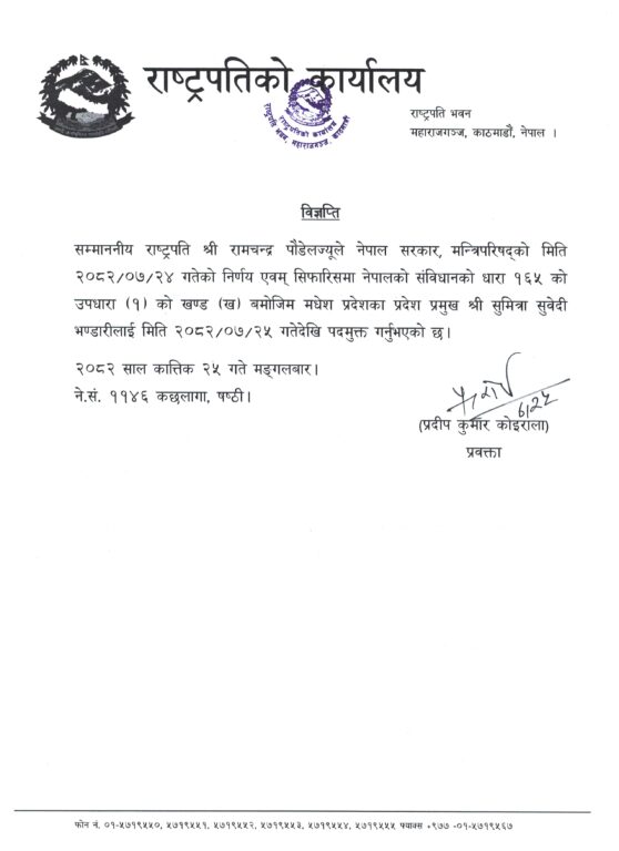 विज्ञप्तिमा भनिएको छ, ‘सम्माननीय राष्ट्रपति श्री रामचन्द्र पौडेलज्यूले नेपाल सरकार, मन्त्रिपरिषद्को मिति २०८२/०७/२४ गतेको निर्णय एवम् सिफारिशमा नेपालको संविधानको धारा १६५ को उपधारा (१) को खण्ड (ख) बमोजिम मधेस प्रदेशका प्रदेश प्रमुख श्री सुमित्रा सुवेदी भण्डारीलाई मिति २०८२/०७/२५ गतेदेखि पदमुक्त गर्नुभएको छ।’