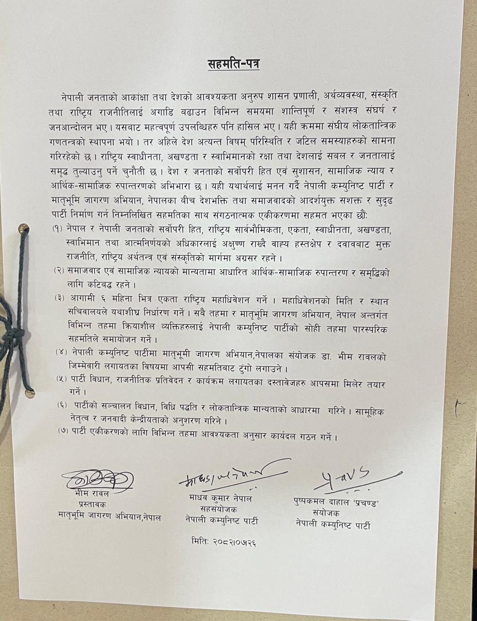 नेकपाको पार्टी कार्यालय पेरिसडाँडामा आयोजिक एक कार्यक्रमबीच सहमति पत्रमा हस्ताक्षर भएको हो । सहमति पत्रमा नेपाली कम्युनिस्ट पार्टीका संयोजक पुष्पकमल दाहाल ‘प्रचण्ड’, सहसंयोजक माधव नेपाल र रावलले हस्ताक्षर गरेका छन्।