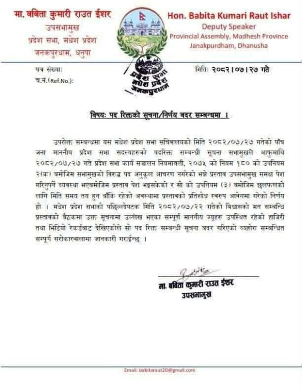 काठमाडौँ-मधेश प्रदेश सभाका पाँच जना सांसदलाई पदमुक्त गर्ने सभामुख रामचन्द्र मण्डलको निर्णय उपसभामुख बबिता कुमारी राउतले बदर गरिदिनुभएको छ।