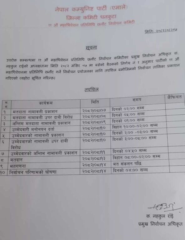 धनकुटा- नेकपा एमाले धनकुटाले पार्टीको एघारौँ महाधिवेशन प्रतिनिधि छनौटका लागि निर्वाचन कार्यतालिका सार्वजनिक गरेको छ। प्रमुख निर्वाचन अधिकृत नहकुल राईको अध्यक्षतामा आज बसेको निर्वाचन समितिको बैठक निर्णयअनुसार मङ्सिर १३ गते सम्म प्रतिनिधि छनोट गरिसक्ने तालिका सार्वजनिक गरेको छ।