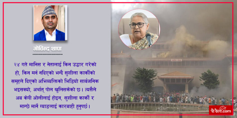 काठमाडौं-नेकपा एमालेका केन्द्रीय सदस्य तथा राजनीतिक विश्लेषक गोविन्द थापाले भदौ २३ गते संसद् भवन जलाउन उक्साउने र आगजनी र लुटमा संलग्न आरोपमा केपी शर्मा ओलीलाई होइन, सुशीला कार्कीलाई तत्काल कारबाही गर्नुपर्ने बताउनु भएको छ।