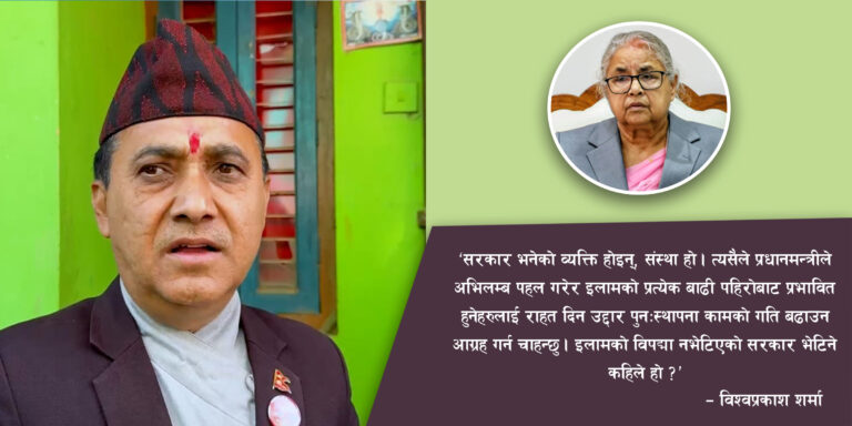 काठमाडौं-नेपाली कांग्रेसका महामन्त्री विश्वप्रकाश शर्माले इलामको विपद्मा नभेटिएको सरकार भेटिने कहिले हो भन्दै प्रश्न गर्नुभएको छ।