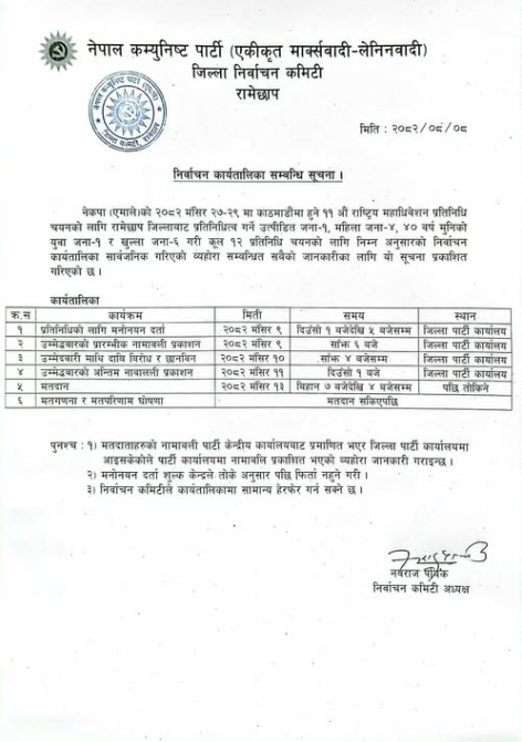 रामेछाप-नेपाल कम्युनिष्ट पार्टी (एमाले) रामेछापको जिल्ला निर्वाचन कमिटी रामेछापले मङ्सिर २७-२९ मा काठमाडौंमा हुने पार्टीको १०औँ राष्ट्रिय महाधिवेशनका लागि प्रतिनिधिहरू छनोट गर्न कार्यतालिका सार्वजनिक गरेको छ।