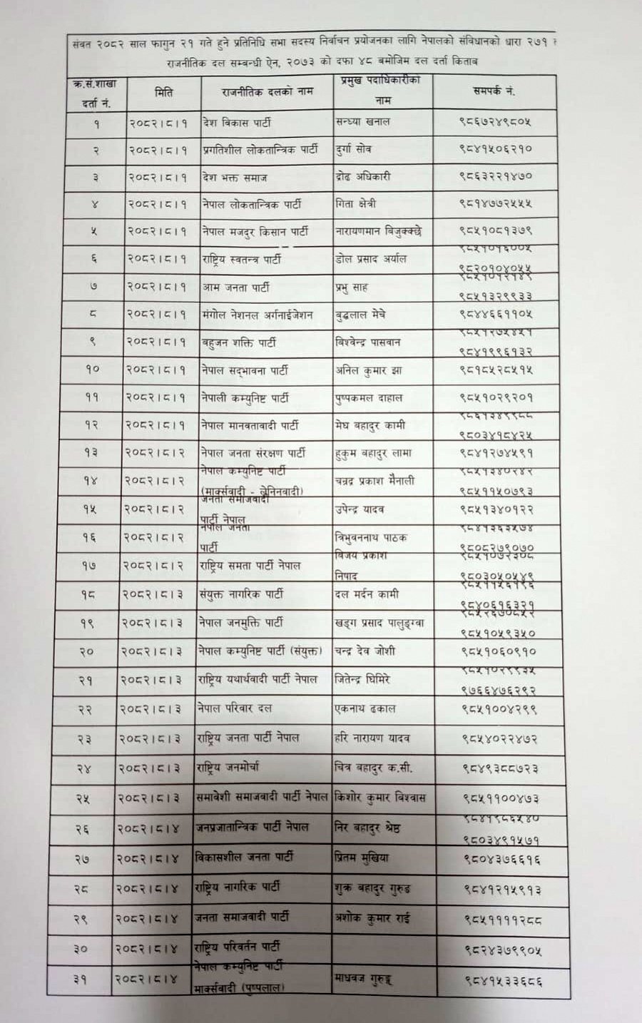 आयोगमा कूल १३५ राजनीतिक दल दर्ता भएकामा निर्वाचन प्रयोजनका लागि बुधबारसम्म पुनःआवेदन दिइसक्नुपर्ने आयोगले जनाएको छ ।