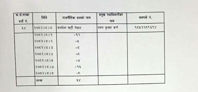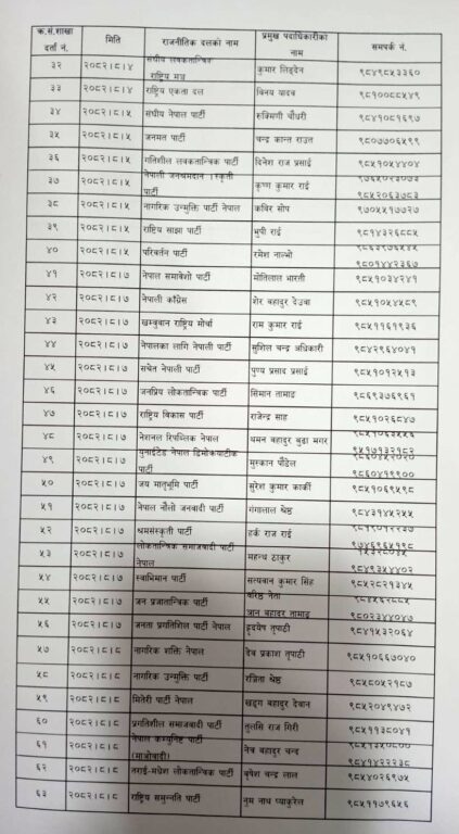 आइतबारसम्म ५६ राजनीतिक दल दर्ता भएकामा सोमबार थपिएका आठसहित ६४ राजनीतिक दल पुगेको आयोगले जनाएको छ । आयोगले यही मङ्सिर १० गतेसम्म प्रतिनिधिसभा निर्वाचनमा भाग लिन चाहने राजनीतिक दललाई दर्ताका लागि समयसीमा निर्धारण गरेको छ ।