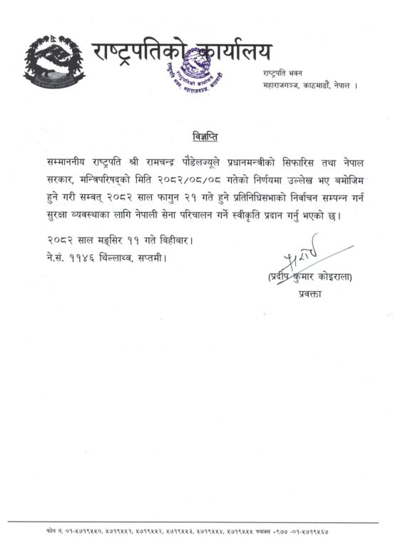राष्ट्रपति कार्यालयका प्रवक्ता प्रदीप कुमार कोइरालाले एक विज्ञप्ति जारी गर्दै आगमी फागुन २१ मा हुने प्रतिनिधिसभा निर्वाचनको सुरक्षाका लागि सेना परिचालनको स्वीकृति दिइएको हो ।