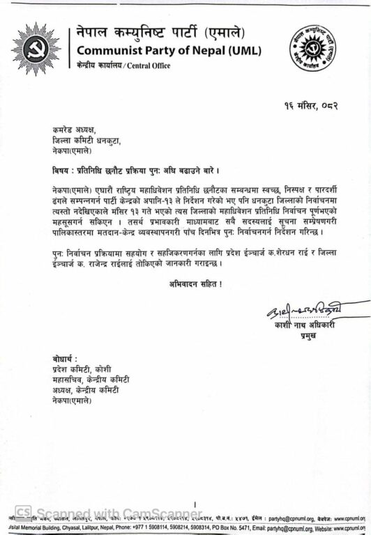 पार्टीको संगठन विभागका प्रमुख काशीनाथ अधिकारीले जिल्ला कमिटीलाई एक पत्र लेख्दै पार्टीको अपानि १३ ले तय गरेको विधिमा नसमेटिने गरी प्रतिनिधि छनौट गरिएकोले त्यसलाई रद्ध गरेर नयाँ प्रक्रियामा जान निर्देशन गरिएको छ । पत्रमा लेखिएको छ त्यस जिल्लाको महाधिवेशन प्रतिनिधि निर्वाचन पूर्ण भएको महसुष गर्न सकिएन ।तसर्थ प्रभावकारी माध्यमबाट सबै सदस्यलाई सुचना सम्प्रेषण गरी पालिकास्तरमा मतदान केन्द्र व्यवस्थापन गरी पाँच दिन भित्र पुन निर्वाचन गर्न निर्देशन गरिन्छ ।