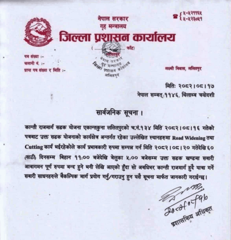 प्रशासनले जारी गरेको सूचना अनुसार, २०८२ मङ्सिर २० गतेदेखि लागू हुने गरी ६० दिनसम्म बिहान ११ बजेदेखि बेलुका ५ बजेसम्म उक्त सडक खण्डमा सवारी आवागमन पूर्ण रूपमा बन्द हुनेछ। कान्ति राजमार्ग सडक योजना, एकान्तकुनाको पत्रानुसार उक्त सडक खण्डका विभिन्न स्थानहरूमा सडक फराकिलो बनाउने र कटिङको काम भइरहेको छ।