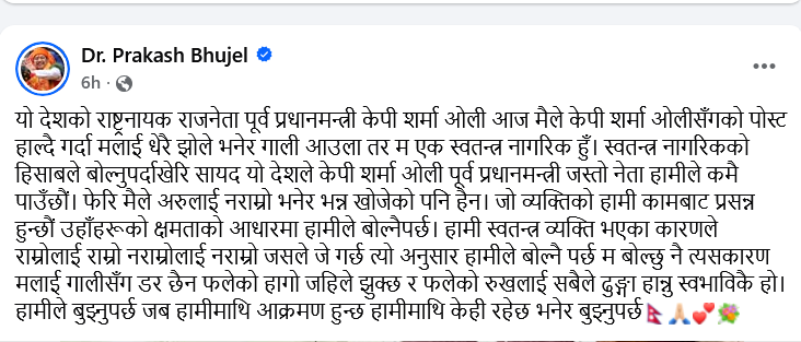 भुजेलले सामाजिक सञ्जाल फेसबुकमा आफूलाई त्यसो भने बापत ‘झोले’ भन्ने आरोप आउने सम्भावना रहेको उल्लेख गर्दै ‘स्वतन्त्र नागरिक’को हैसियतले खुलेर बोल्ने अधिकार प्रयोग गर्ने बताउनुभएको छ।
