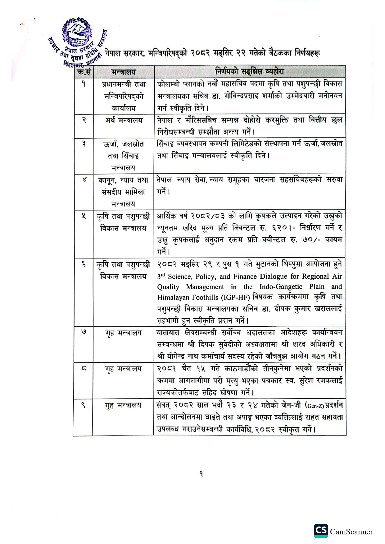 काठमाडौँ-सरकारले मंसिर २२ गते सोमबार बसेको मन्त्रिपरिषद् बैठकका निर्णय सार्वजनिक गरेको छ। मङ्गलबार सरकारका प्रवक्ता एवम् सञ्चार तथा सूचना प्रविधिमन्त्री जगदीश खरेलले पत्रकार सम्मेलन गर्नुहुँदै मन्त्रिपरिषद् बैठकका निर्णय सार्वजनिक गर्नुभएको हो। मन्त्री खरेलले मन्त्रिपरिषद्का १८ निर्णय एकसाथ सार्वजनिक गर्नुभएको हो।