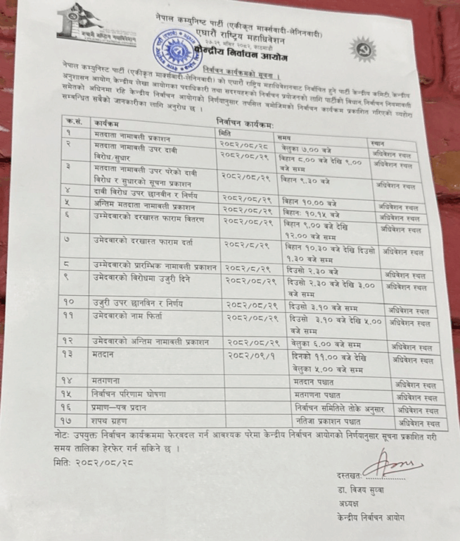 काठमाडौं-नेकपा एमालेको नयाँ नेतृत्व चयनका लागि निर्वाचन तालिका प्रकाशन गरिएको छ। केन्द्रिय निर्वाचन आयोगले आज बेलुकी ७ बजेदेखि पुस १ गतेसम्मको कार्यक्रम सार्वजनिक गरेको हो।
