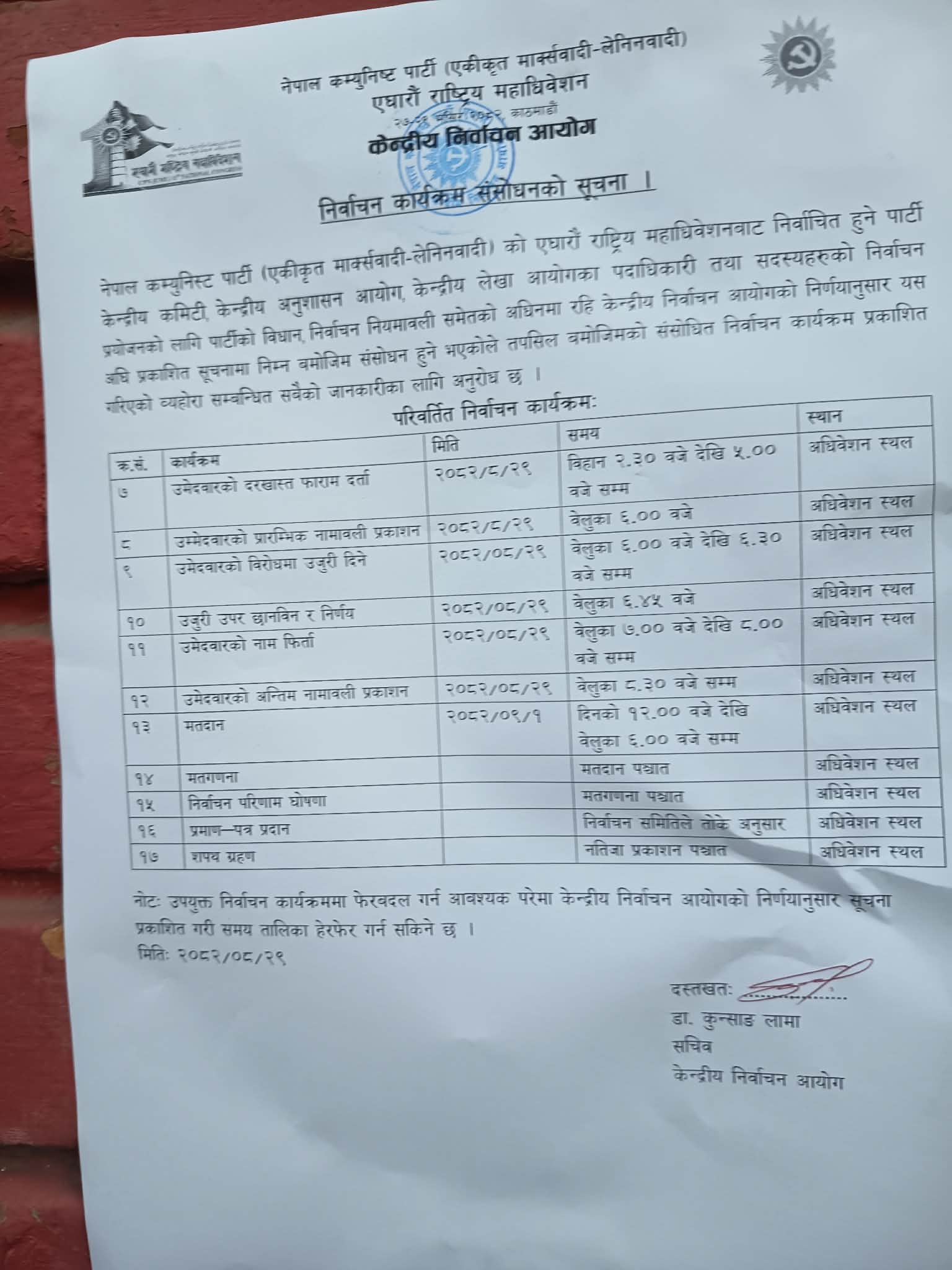 यस्तै, उम्मेदवारको प्रारम्भिक नामावली बेलुका ६ बजे प्रकाशन गरिनेछ भने अन्तिम नामावली प्रकाशन राति साढे ८ बजे हुनेछ। त्यसपछि मंगलबार बिहान १२ देखि साँझ ६ बजेसम्म मतदान गर्ने गरी कार्यतालिका संशेधन गरिएको केन्द्रीय निर्वाचनले जानकारी दिए ।