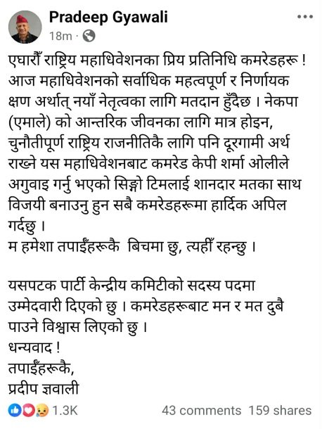 आज बिहानै सामाजिक सञ्जाल फेसबुक मार्फत महाधिवेशन प्रतिनिधिहरूलाई सम्बोधन गर्दै नेता ज्ञवालीले आजको मतदानलाई पार्टीको आन्तरिक जीवनका साथै राष्ट्रिय राजनीतिको दृष्टिले पनि निर्णायक र दूरगामी महत्वको क्षण भएको उल्लेख गर्नु भएकाे छ। चुनौतीपूर्ण राजनीतिक परिस्थितिमा पार्टीलाई सही दिशामा अघि बढाउन केपी ओली नेतृत्वको टिम आवश्यक रहेको उहाँको धारणा छ।