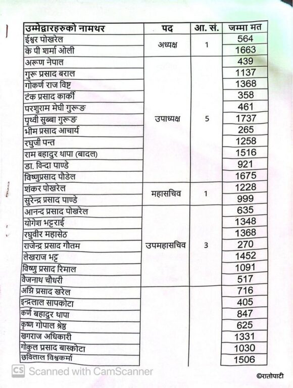 काठमाडौँ-नेकपा एमालेको पदाधिकारीदेखि केन्द्रीय सदस्यसम्मका उम्मेदवारले पाएको मतपरिणाम सार्वजनिक भएको छ। निर्वाचन आयोगले बिहीबार उम्मेदवारले पाएको मतपरिणाम सार्वजनिक गरेको हो।