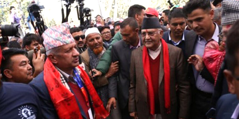 अध्यक्षमा निर्वाचित भएका केपी ओलीले महाधिवेशनस्थल भृकुटीमण्डपमै नेता कार्यकर्तासँग खुसीयाली मनाएका छन्। शपथ अघि महाधिवेशन आयोजनास्थल भृकुटीमण्डपमा अहिले ओलीसहित निर्वाचित पदाधिकारीलाई नेता, कार्यकर्ताले माला तथा खादा लगाएर बधाई दिइरहेका छन् ।