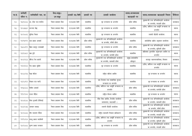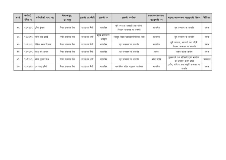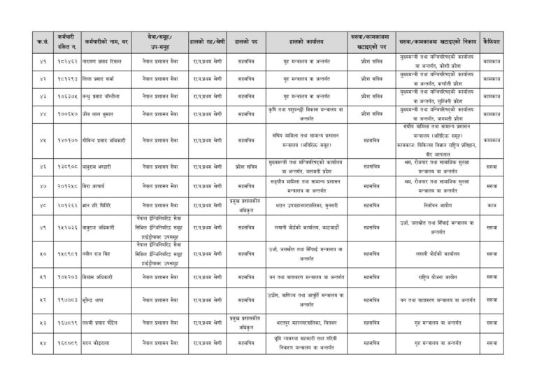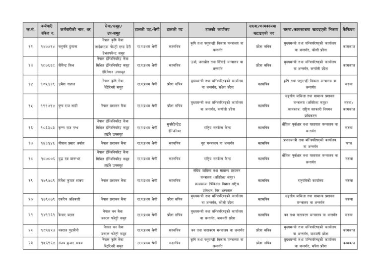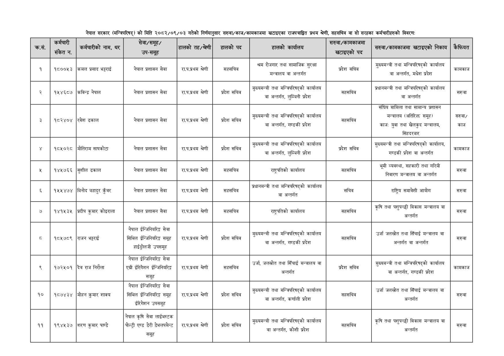 कविन्द्र नेपाललाई प्रधानमन्त्री तथा मन्त्रिपरिषद्को कार्यालयमा सरुवा गरिएको छ। विनोद कुमार कुँवरलाई राष्ट्रिय समावेशी आयोगमा सरुवा गरिएको छ। त्यस्तै सुशील ढकाललाई भूमि व्यवस्था,सहकारी तथा गरिबी निवारण मन्त्रालयमा सरुवा गरिएको छ।