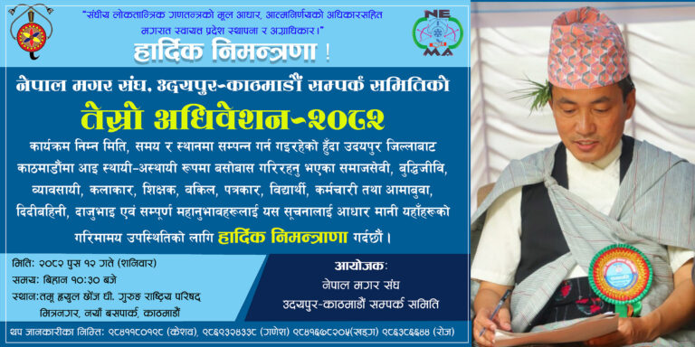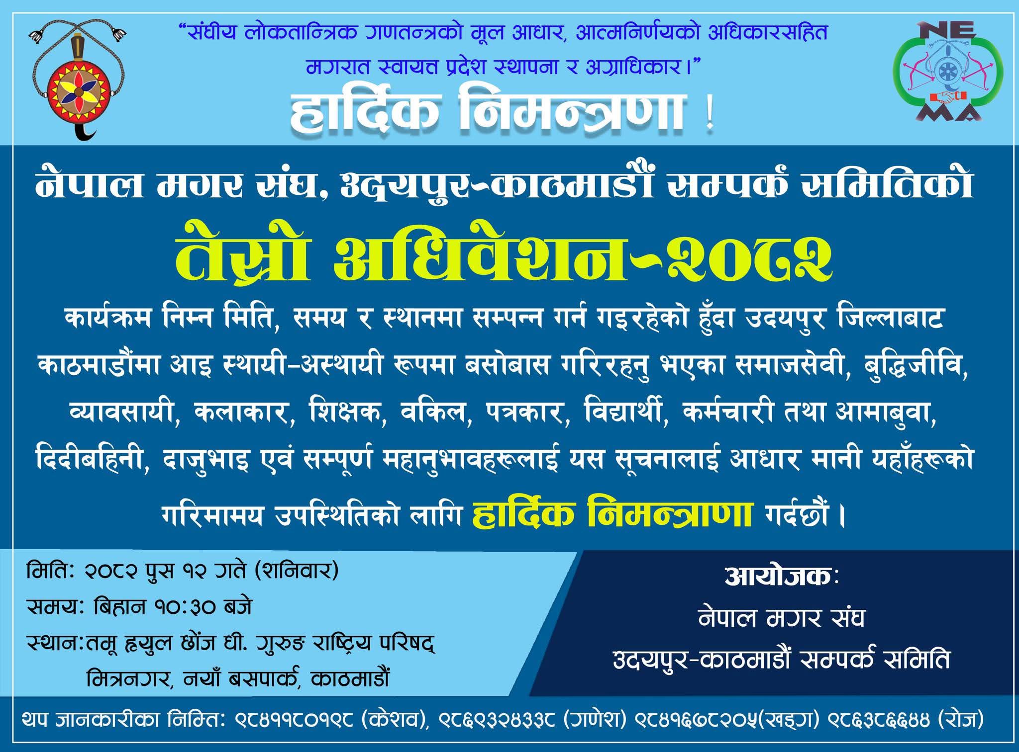 समितिको तेस्रो अधिवेश काठमाडौंको नयाँ बसपार्क नजिकै मित्रनगरस्थित तमू ह्युल छोंज धी. गुरुङ राष्ट्रिय परिषद् हलमा सम्पन्न गर्न गइरहेको हुनाले जन्मथलो उदयपुर छाडेर कर्मथलो काठमाडौं उपत्यका अस्थायी र स्थायी बसोबास गर्नुहुने आदरणीय बुद्धिजीवि, समाजसेवी, व्यावसायी, शिक्षक, पत्रकार, वकिल, कर्मचारी, विद्यार्थी, कलाकार, आमाबुबा, दाजुभाइ, दिदीबहिनी एवं मगर समितिका शुभेच्छुक, शुभचिन्तक साथै समितिका सल्लाहकारहरु तथा उदयपुरका पालिका र नगरपालिकाका सम्पूर्ण महानुभावहरुलाई उपस्थितिका लागि समितिका अध्यक्ष मगरले हार्दिक अनुरोध गर्नुभएको छ।