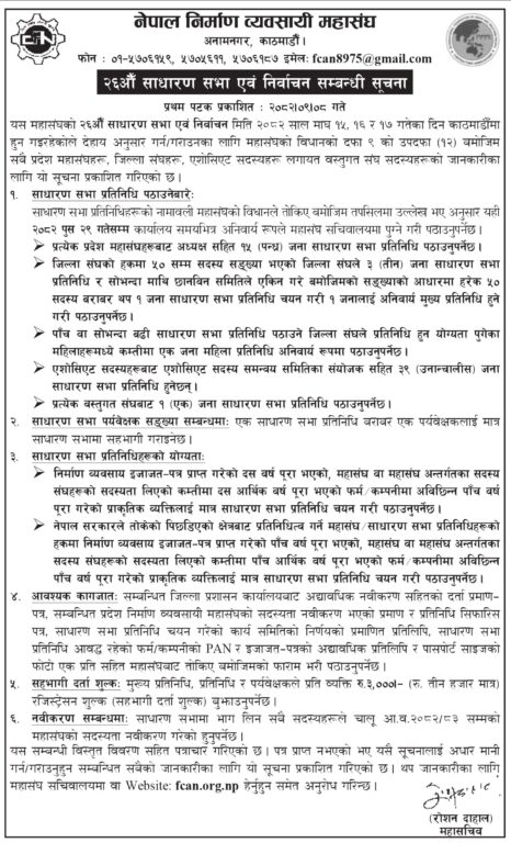 काठमाडौँ-नेपाल निर्माण व्यवसायी महासंघले २६औँ साधारण सभा तथा नयाँ नेतृत्व चयनका लागि निर्वाचनको मिति तय गरेको छ। महासंघको सचिवालयले प्रकाशित गरेको सूचना अनुसार आगामी २०८२ साल माघ १५, १६ र १७ गते काठमाडौँमा महासंघको ठूलो भेला र निर्वाचन कार्यक्रम सञ्चालन हुनेछ।