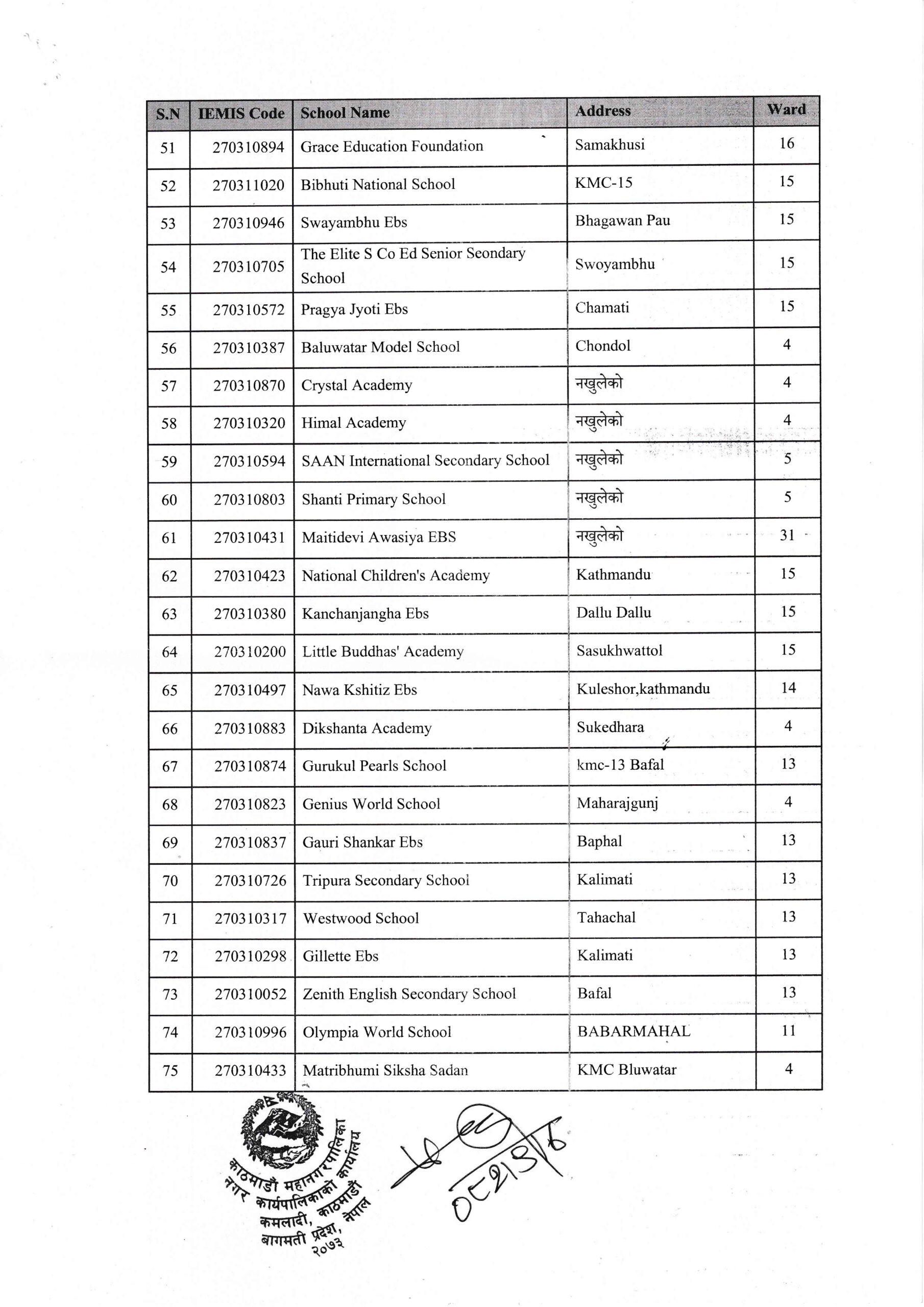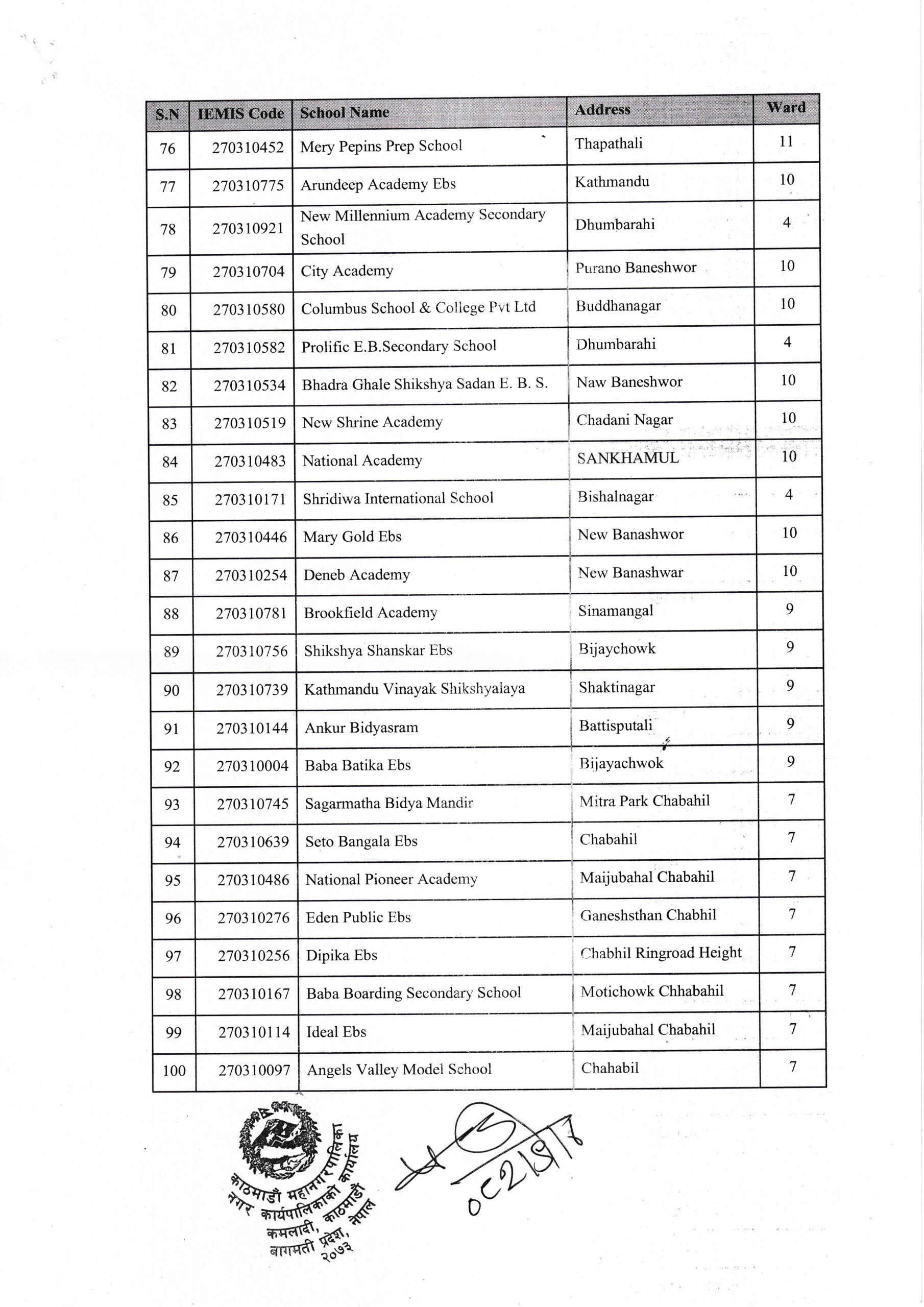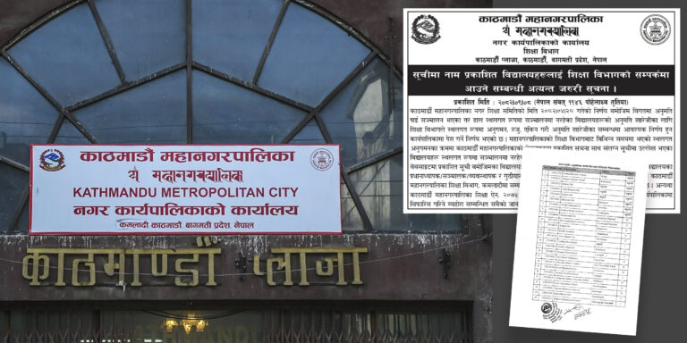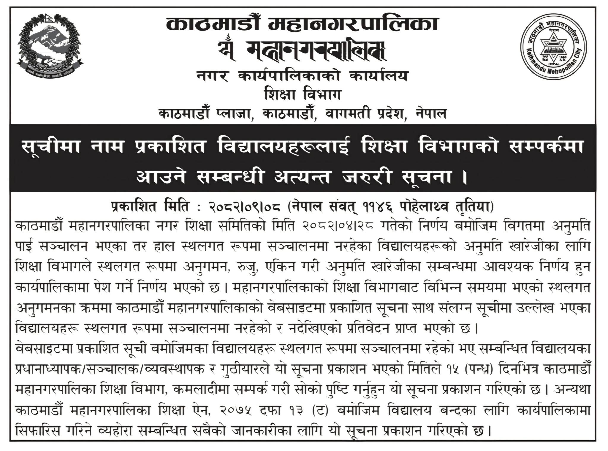काठमाडौँ महानगरपालिकाको शिक्षा विभागले आज सूचना जारी गर्दै सूचीमा नाम प्रकाशित भएका विद्यालयहरुलाई शिक्षा विभागको सम्पर्कमा आउन भनेको हो।