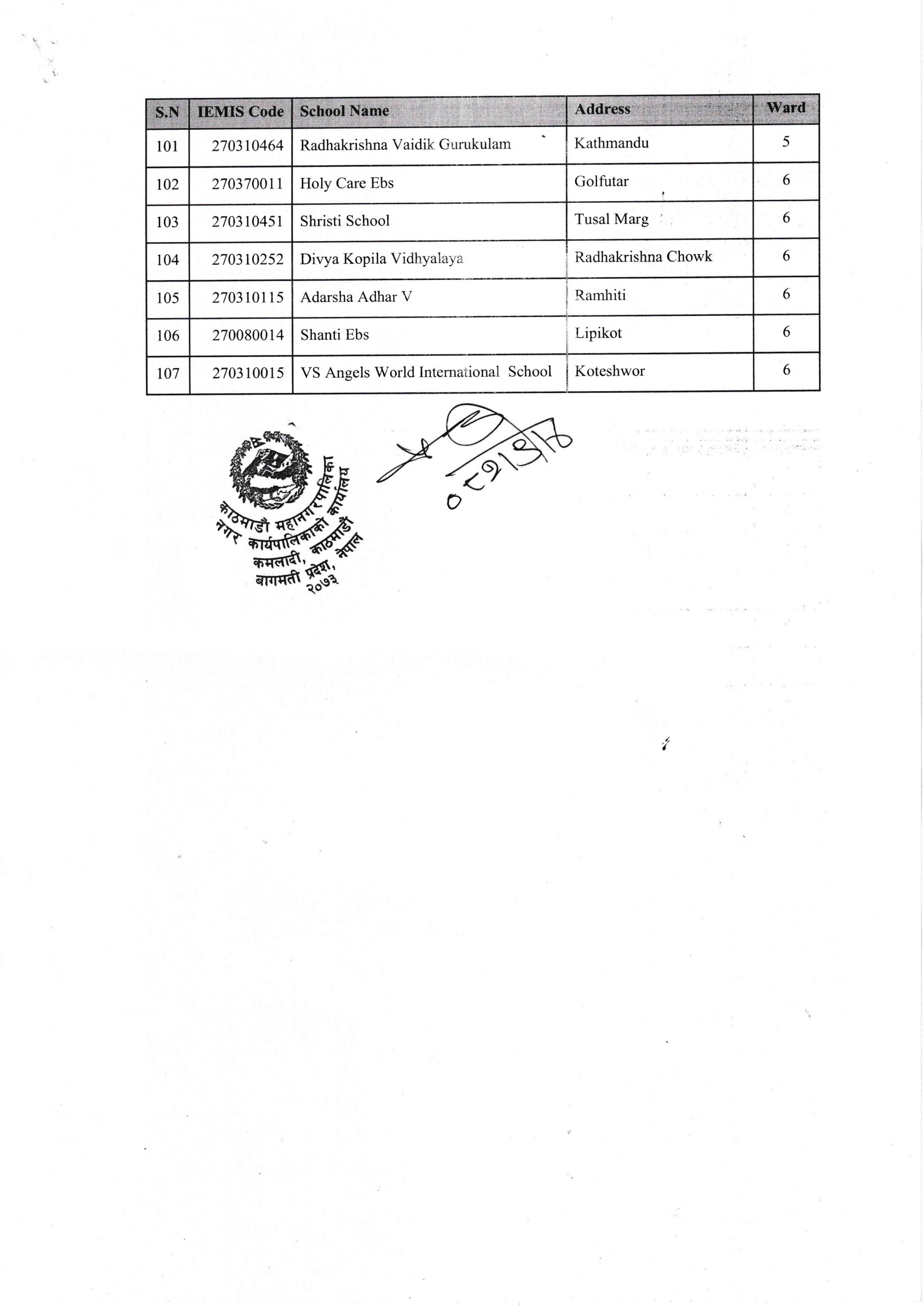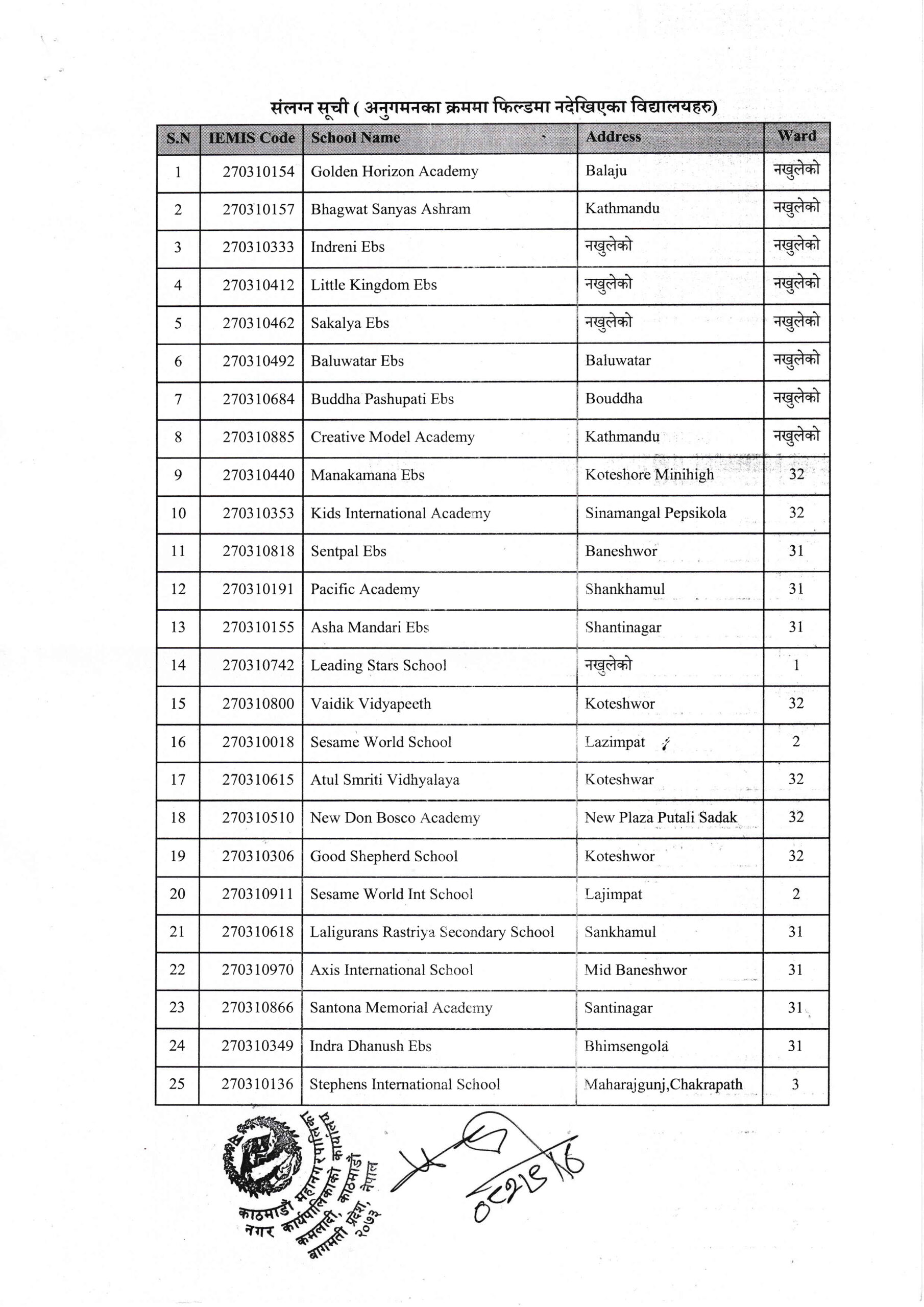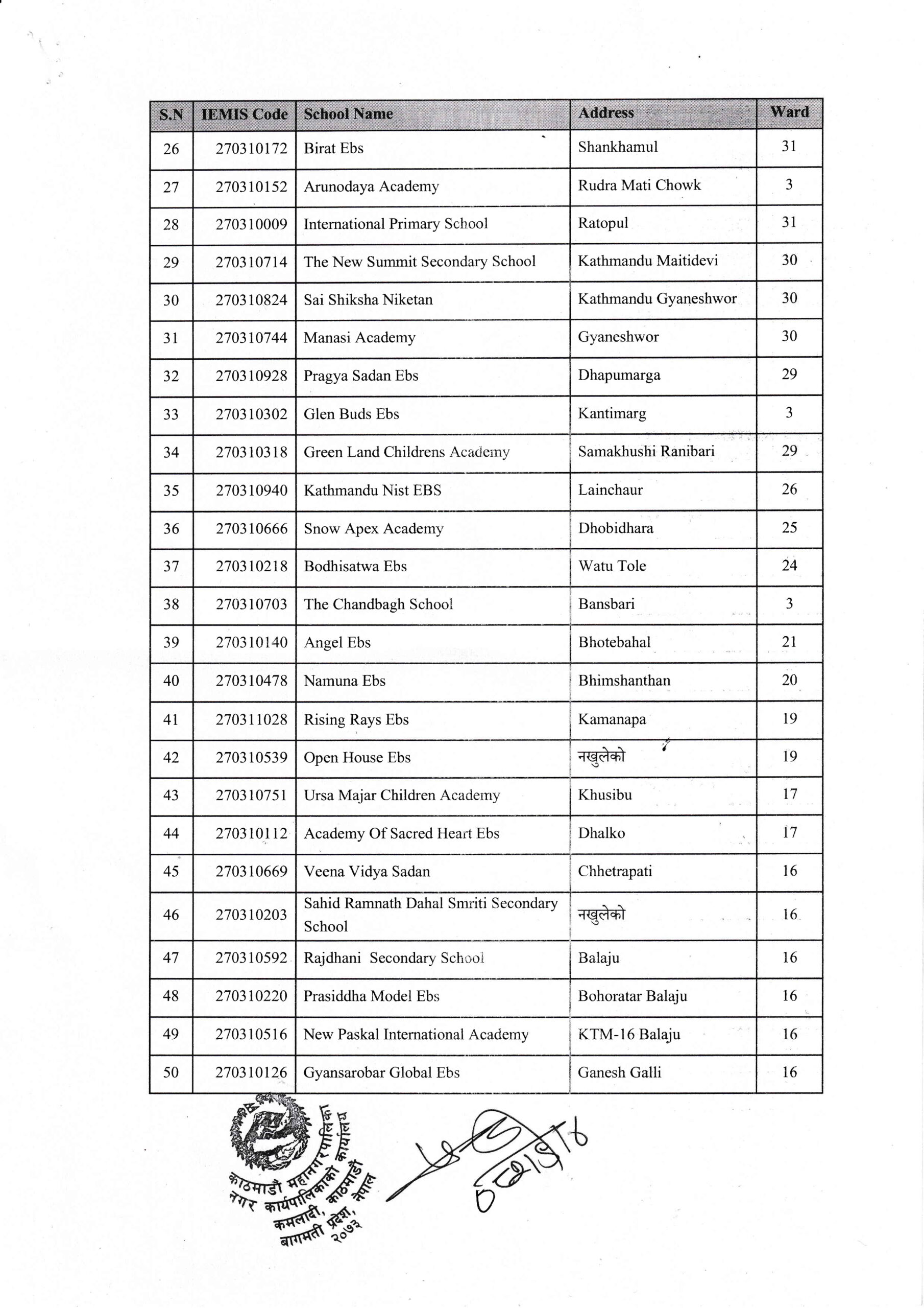 काठमाडौँ महानगरपालिकाको शिक्षा विभागले आज सूचना जारी गर्दै सूचीमा नाम प्रकाशित भएका विद्यालयहरुलाई शिक्षा विभागको सम्पर्कमा आउन भनेको हो।