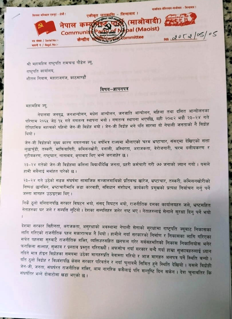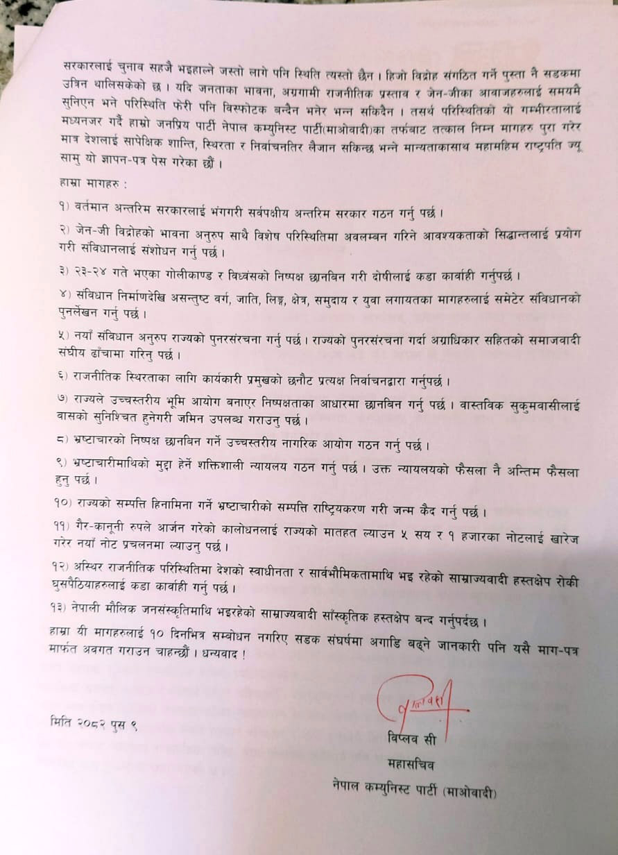 बुधबार राष्ट्रपति रामचन्द्र पौडेललाई १३ बुँदे ज्ञापनपत्र बुझाउँदै नेकपा माओवादीले कार्की नेतृत्वको अन्तरिम सरकार भङ्ग गर्न माग गरेको हो ।