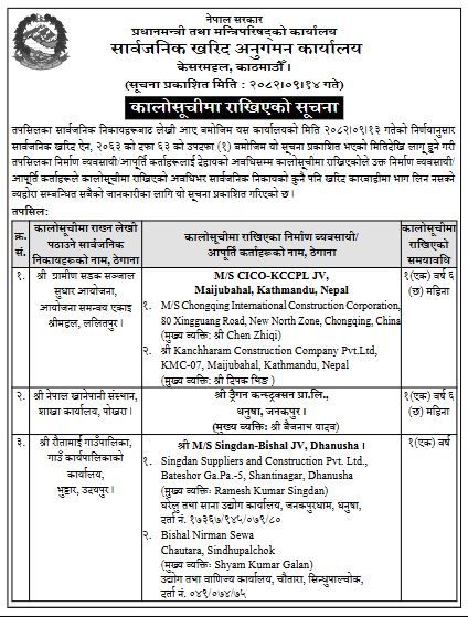 यसैगरी, रौतामाई गाउँपालिका उदयपुरको सिफारिसमा सिङ्दान सप्लायर्स एण्ड कन्स्ट्रक्सन प्रालि धनुषा र विशाल निर्माण सेवा सिन्धुपाल्चोक एक–एक वर्षका लागि कालोसूचीमा परेका छन्।