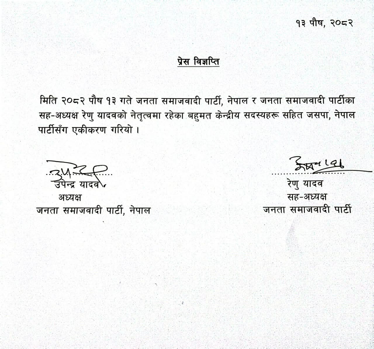 जनता समाजवादी पार्टीकी सहअध्यक्ष रेणु यादव र उपमहासचिव प्रदीप यादवले पार्टी परित्याग गरेको घोषणा गर्दै लोकतान्त्रिक समाजवादी पार्टी (लोसपा) र जनता समाजवादी पार्टी नेपालबीचको एकतालाई स्वीकार गर्दै आज जसपाका अध्यक्ष उपेन्द्र यादवसँग सहमतिपत्रमा हस्ताक्षर गरेका हुन् ।