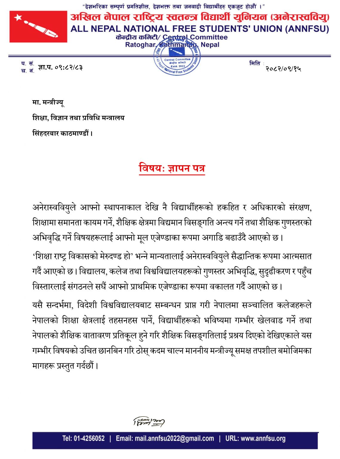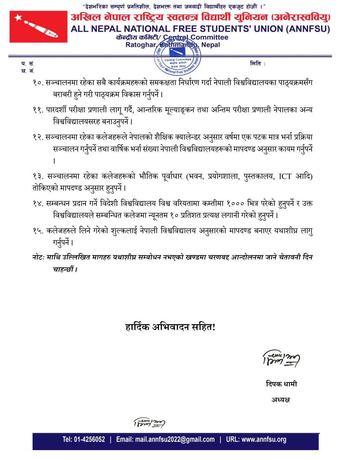 अखिल अध्यक्ष दीपक धामी नेतृत्वको टोलीले विदेशी विश्वविद्यालयबाट सम्बन्धन प्राप्त गरी नेपालमा सञ्चालनमा रहेका कलेजहरूसँगको सरोकारका विषयमा शिक्षामन्त्री पुनलाई भेटेर १५ बुँदे मागसहितको ज्ञापन पत्र पेश गरेको हो ।