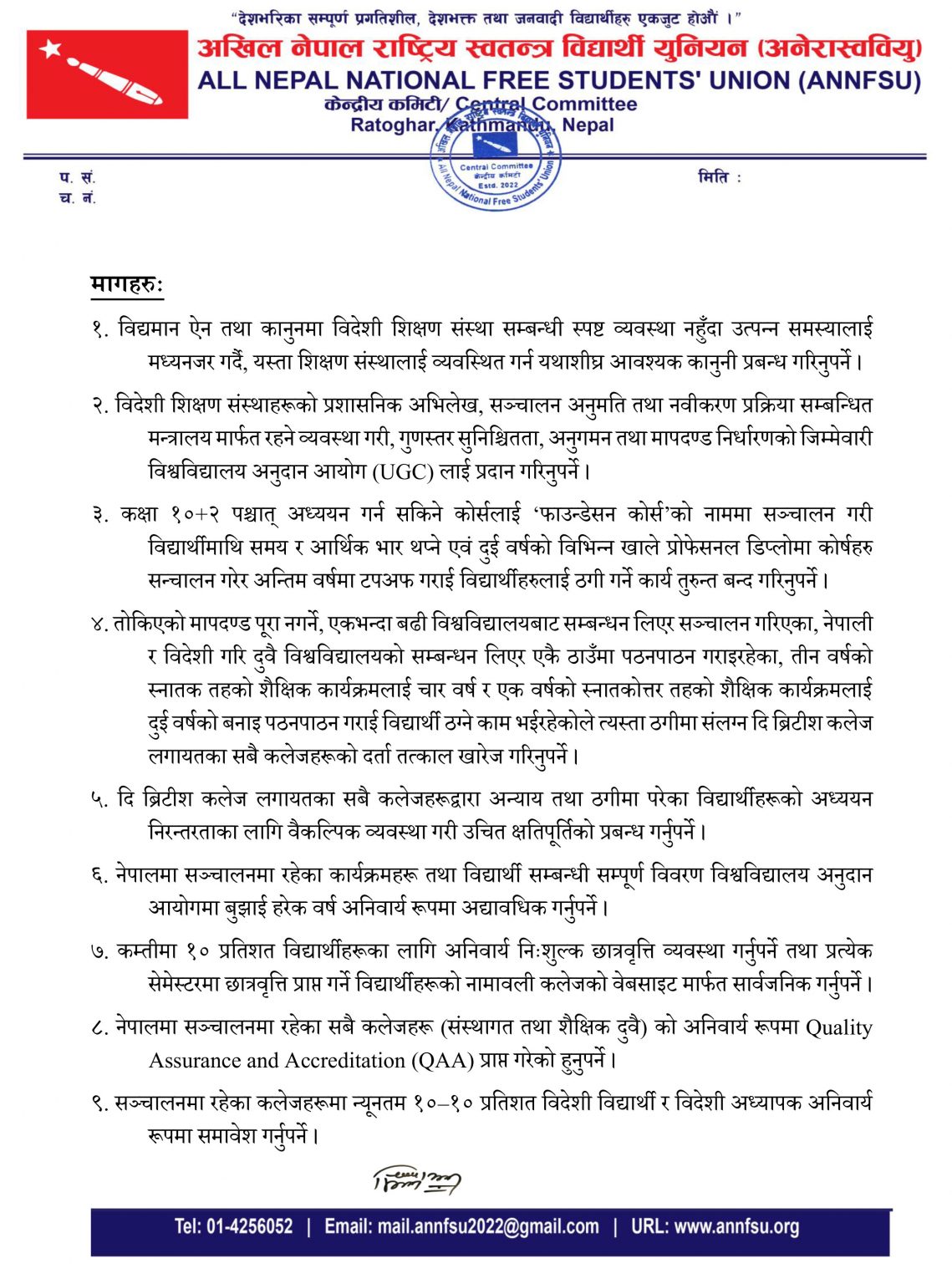 ज्ञापनपत्रमा विदेशी कलेजहरूले नेपालको शिक्षा क्षेत्रलाई तहसनहस पारेको, विद्यार्थीको भविष्यमाथि खेलबाड गरेको र प्रचलित मापदण्ड विपरीत सञ्चालन भइरहेको जिकिर गरिएको छ।