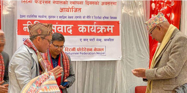 रिटर्नी फेडेरेसन नेपालको स्थापना दिवसको अवसरमा देशमा राजनीतिक स्थायित्व , सुशासन र समृद्धिमा नेकपा एमालेको नीति र रिटर्नीको भूमिका विषयमा आयोजित नीति संवादमा उपाध्यक्ष पौडेलले विदेशबाट फर्केकाहरुको सीप र पुँजीलाई एकीकृत गरेर देश विकासमा लगाउनुपर्ने बताउँदै नवयुग ईन्भेस्टमेन्ट जस्ता कम्पनी खोलेर रिटर्नी फेडेरेसनले सातै प्रदेशमा उदाहरणीय काम गर्न आग्रह गर्नुभयो। उहाँले सही नीति र नेतृत्वले मात्र देश समृद् बन्ने बताउनु भयो। साथै उहाँले फेडेरेसनको वेबसाईटको शुभारम्भ गर्नुभयो।