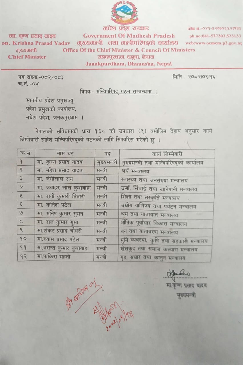 प्रदेश प्रमुख सुरेन्द्र लाल कर्णले मुख्यमन्त्री यादवको सिफारिसमा मनिषकुमार सुमन (श्रम तथा याताया मन्त्रालय), राजकुमार गुप्ता (भौतिक पूर्वाधार विकास मन्त्रालय), शंकरप्रसाद चौधरी (वन तथा वातावरण मन्त्रालय), श्यामप्रसाद पटेल (भूमि व्यस्था, कृषि तथा सहकारी मन्त्रालय), वसन्तकुमार कुशवाहा (खेलकुद तथा समाज कल्याण मन्त्रालय) र फकिरा महतो (गृह, सञ्चार तथा कानुन मन्त्रालय) लाई मन्त्रीमा नियुक्त गरेका हुन्।