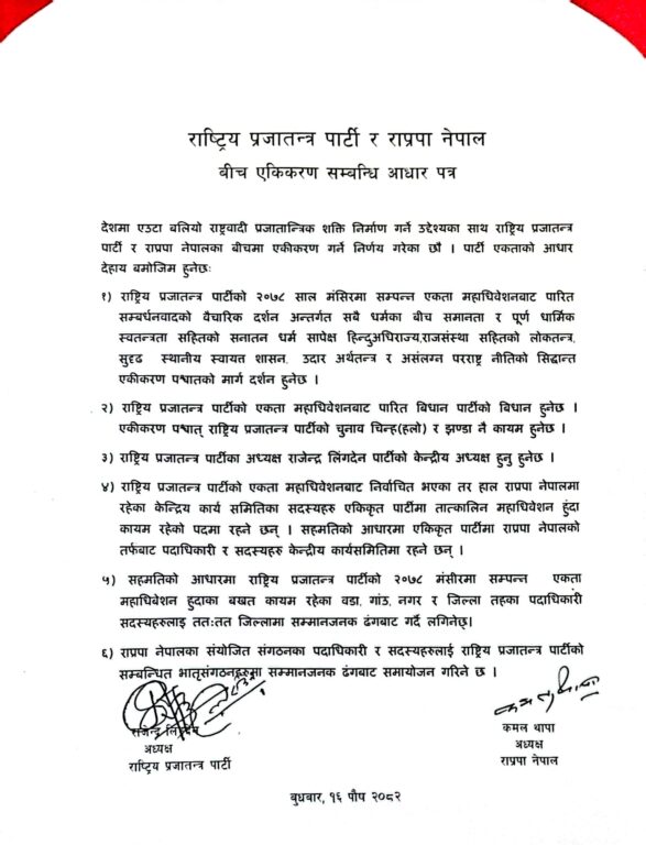 सहमति पत्रमा राप्रपाका तर्फबाट अध्यक्ष राजेन्द्र लिङ्देन र राप्रपा नेपालका तर्फबाट अध्यक्ष कमल थापाले हस्ताक्षर गर्नुभएको छ। पार्टीको नाम राप्रपा नै रहनेछ। यसैगरी पार्टीको केन्द्रीय अध्यक्ष राजेन्द्र लिङ्देन नै रहेका छन् भने पार्टीको विधान, झण्डा र चुनाव चिन्ह साविकको राष्ट्रिय प्रजातन्त्र पार्टीकै (हलो) कायम हुने सहमति भएको छ।