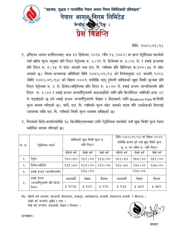 निगमका अनुसार प्रतिलिटर पेट्रोल रु. ४, डिजेल/मट्टितेल प्रतिलिटर रु. ५ ले घटाइएको छ ।