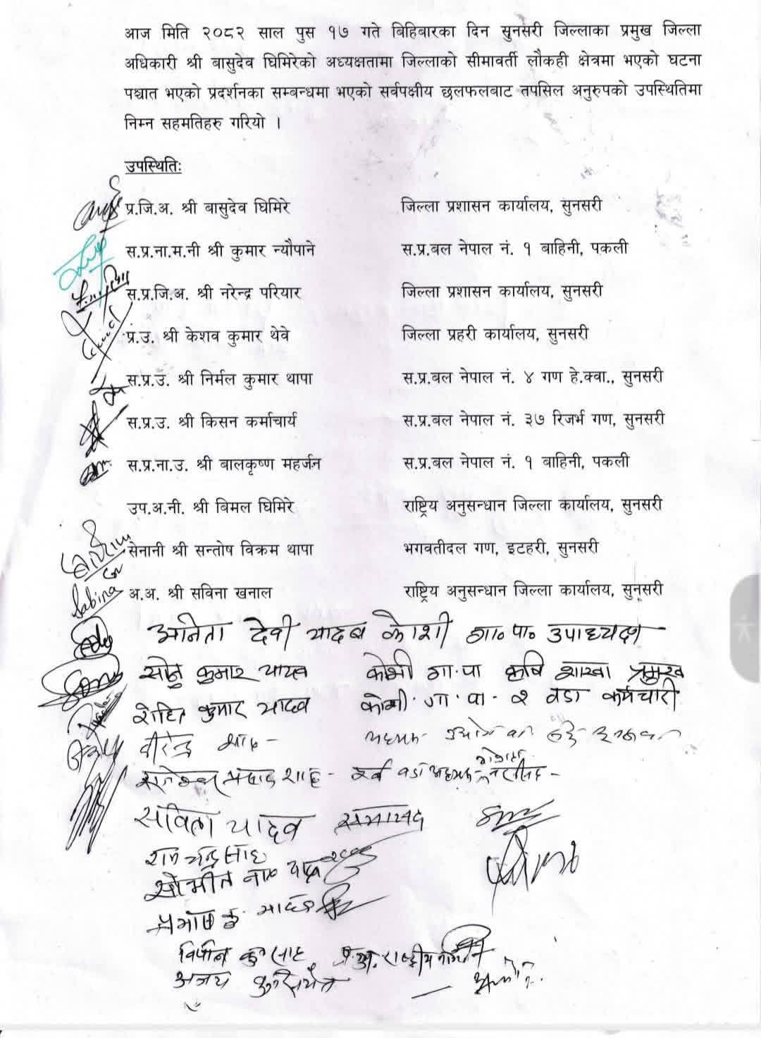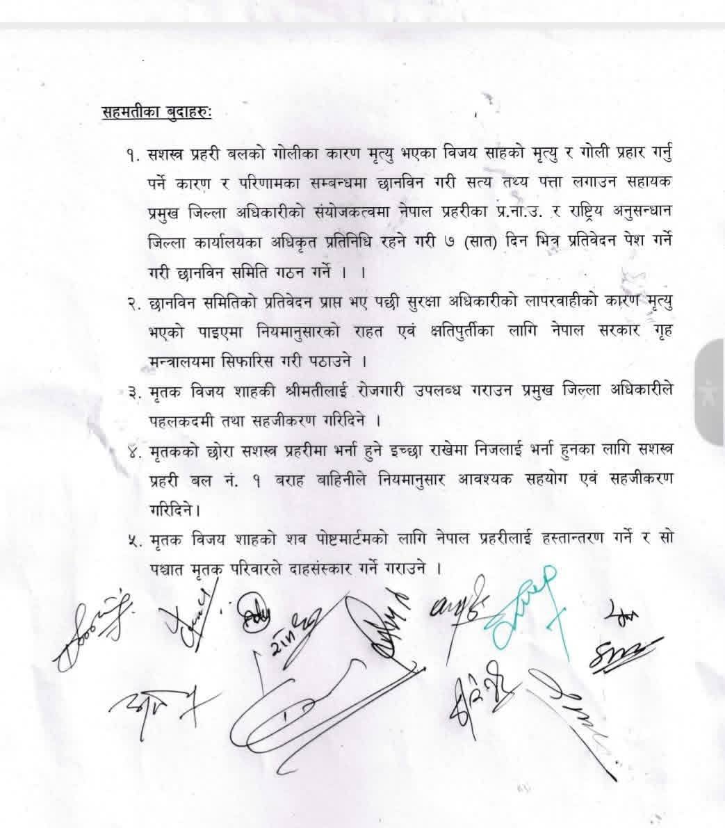 ५. शव व्यवस्थापन : सहमति भएसँगै मृतकको शवलाई पोस्टमार्टमका लागि नेपाल प्रहरीलाई हस्तान्तरण गर्ने र त्यसपछि परिवारले दाहसंस्कार गर्ने सहमति भएको छ । सहमति पत्रमा स्थानीय प्रतिनिधि, सुरक्षा निकायका प्रमुख र पीडित पक्षका प्रतिनिधिहरूले हस्ताक्षर गरेका छन् ।