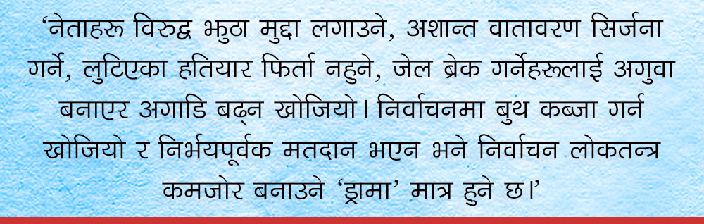 अध्यक्ष ओलीले भन्नुभयो, ‘नेताहरूविरूद्ध झुठा मुद्दा लगाउने, अशान्त वातावरण सिर्जना गर्ने, लुटिएका हतियार फिर्ता नहुने, जेलब्रेक गर्नेहरूलाई अगुवा बनाएर अगाडि बढ्न खोजियो, निर्वाचनमा बुथ कब्जा गर्न खोजियो र निर्भयपूर्वक मतदान भएन भने निर्वाचन लोकतन्त्र कमजोर बनाउने ‘ड्रामा’ मात्र हुने छ।’