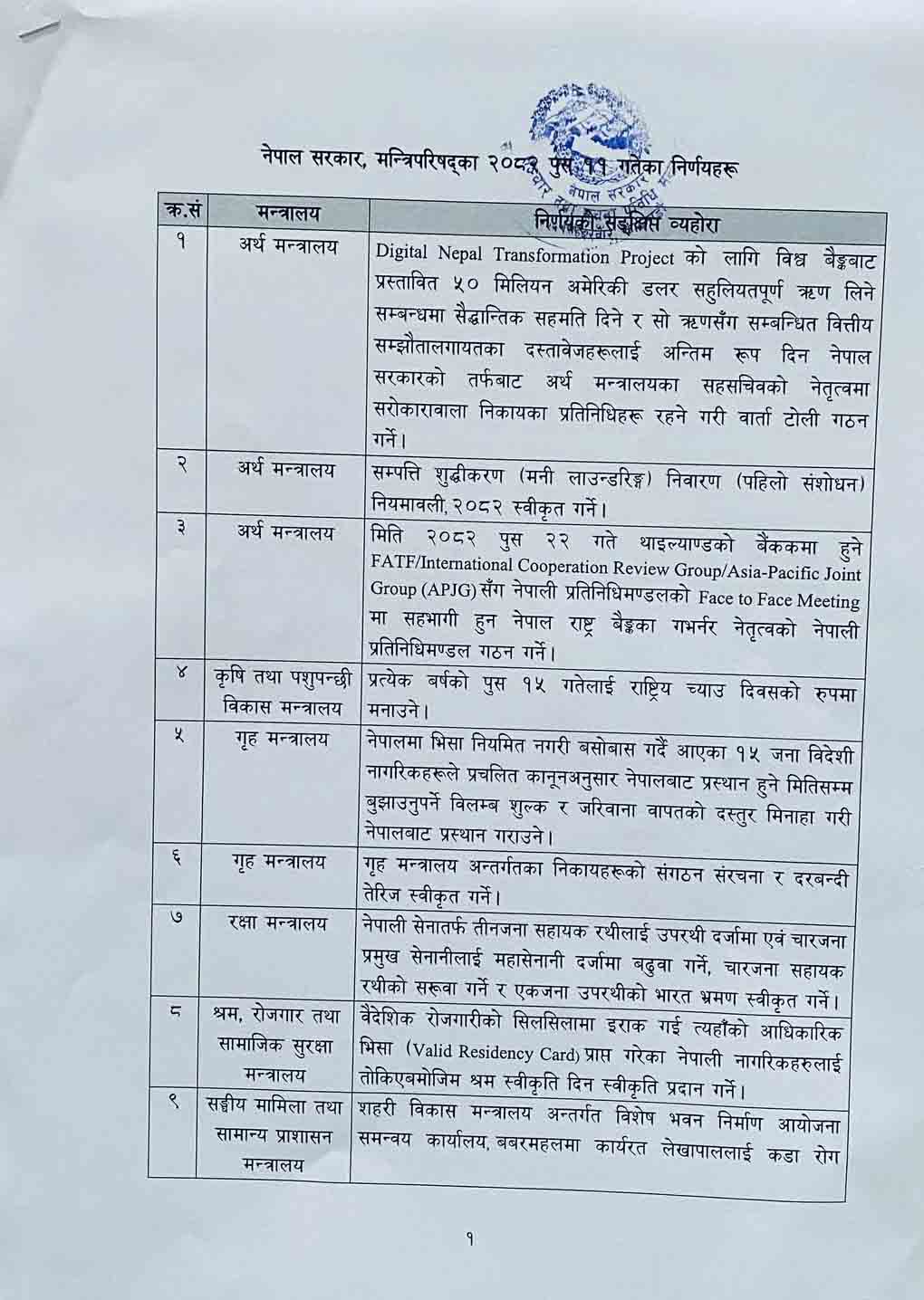 पुस ११ र २१ गतेको मन्त्रिपरिषद् बैठकका निर्णयः