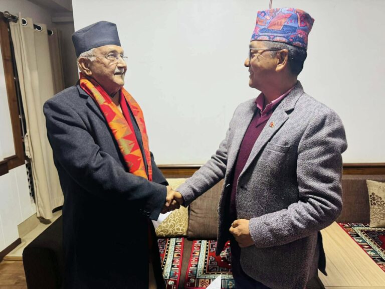 काठमाडौँ-नेकपा एमालेका अध्यक्ष एवं पूर्वप्रधानमन्त्री केपी शर्मा ओली र राष्ट्रिय प्रजातन्त्र पार्टी(राप्रपा)का अध्यक्ष राजेन्द्र लिङ्देनबिच भेटवार्ता भएको छ।