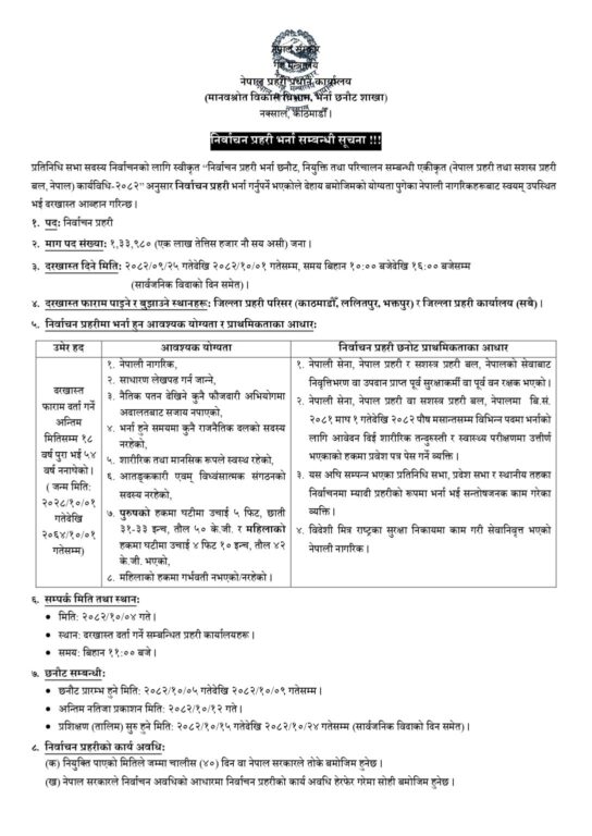 नेपाल प्रहरी प्रधान कार्यालयअन्तर्गत मानवस्रोत विकास विभाग (भर्ना छनोट शाखा)ले १ लाख ३३ हजार ९८० जना निर्वाचन प्रहरी माग गरेको हो ।